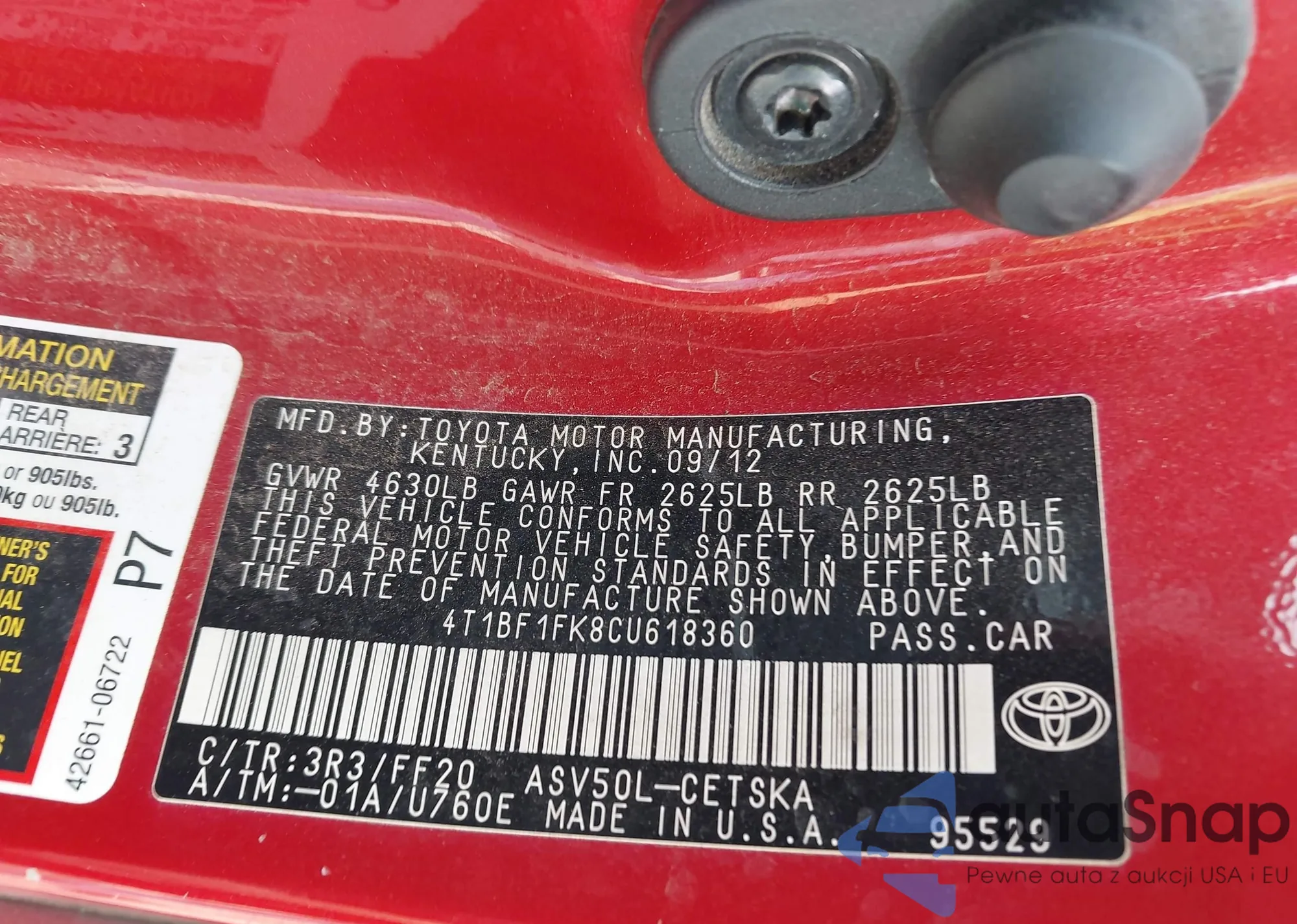 • VIN 4T1BF1FK8CU618360