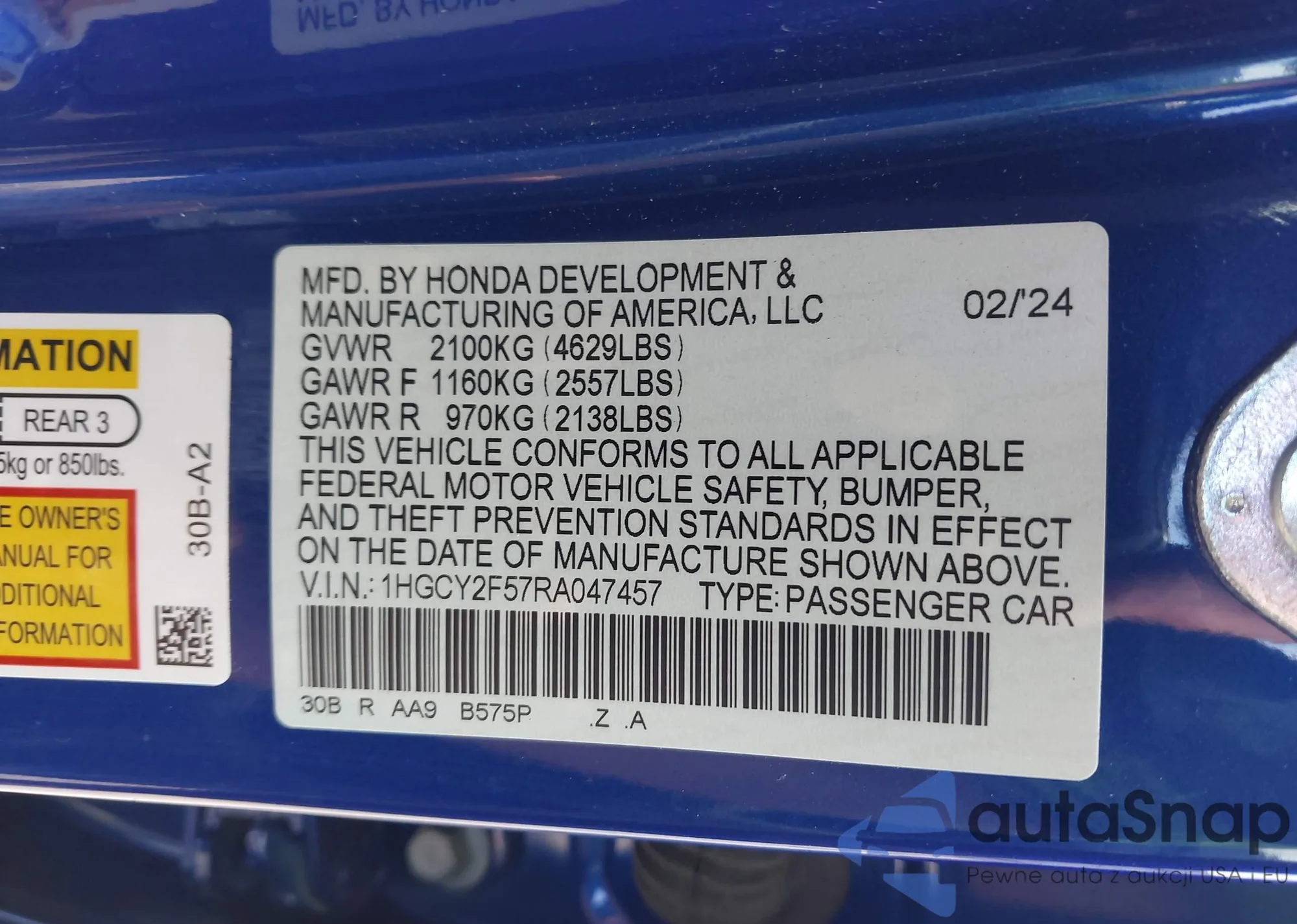 LOT: 43239107 VIN: 1HGCY2F57RA047457