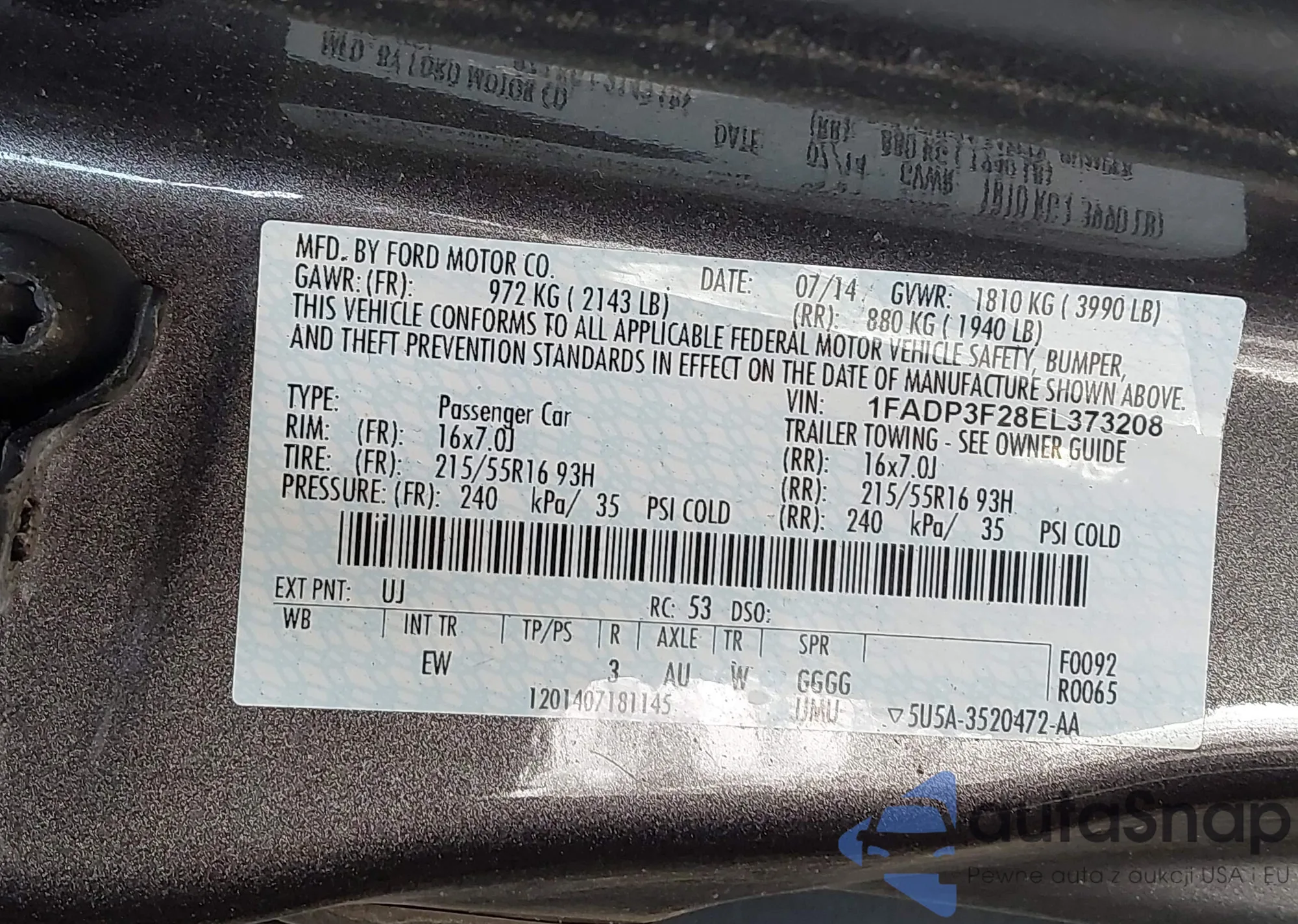 LOT: 43652716 VIN: 1FADP3F28EL373208