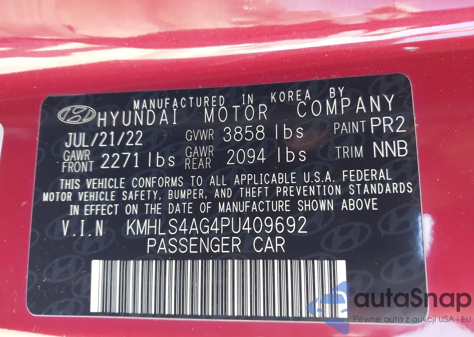 LOT: 43394954 VIN: KMHLS4AG4PU409692