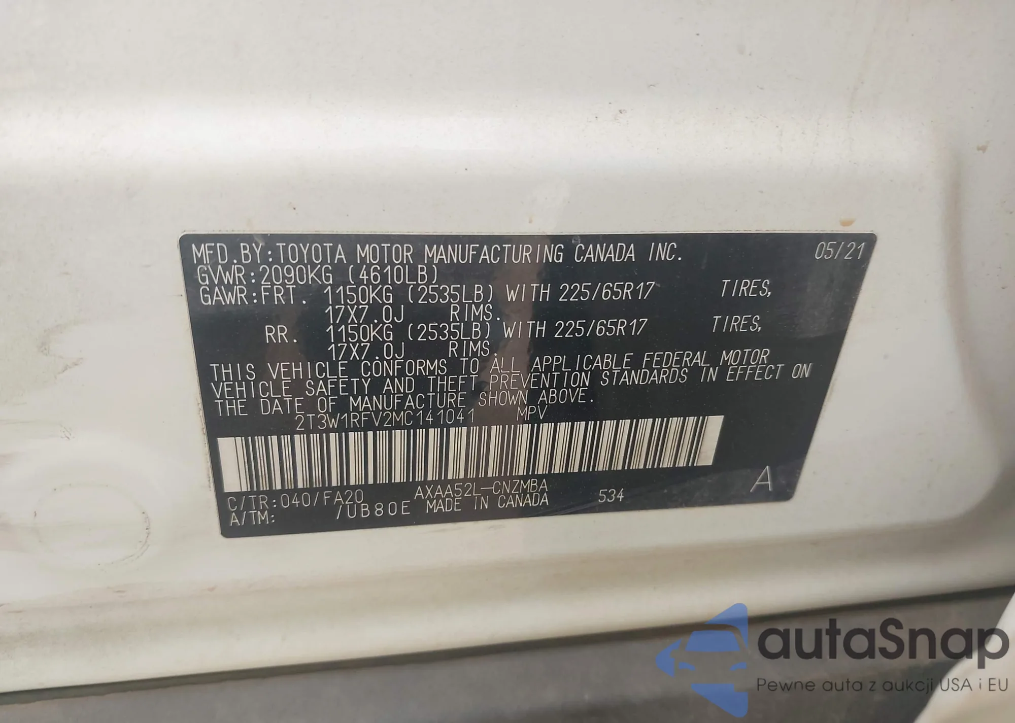 LOT: 43706037 VIN: 2T3W1RFV2MC141041