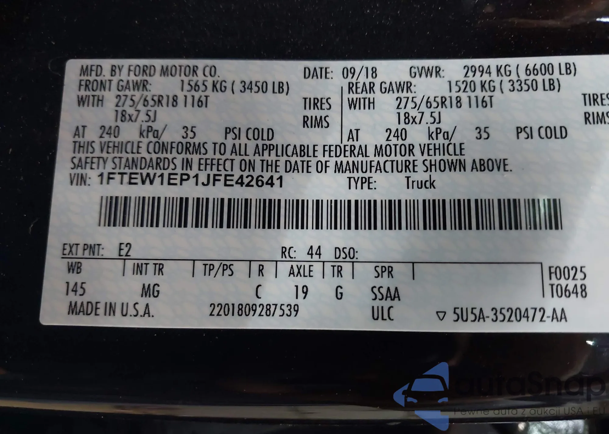 LOT: 43856702 VIN: 1FTEW1EP1JFE42641