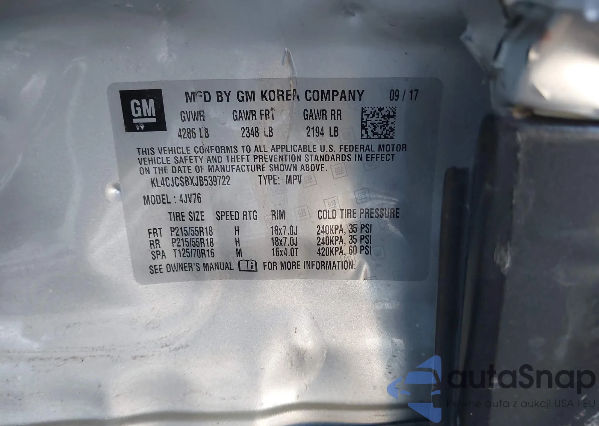 • VIN KL4CJCSBXJB539722