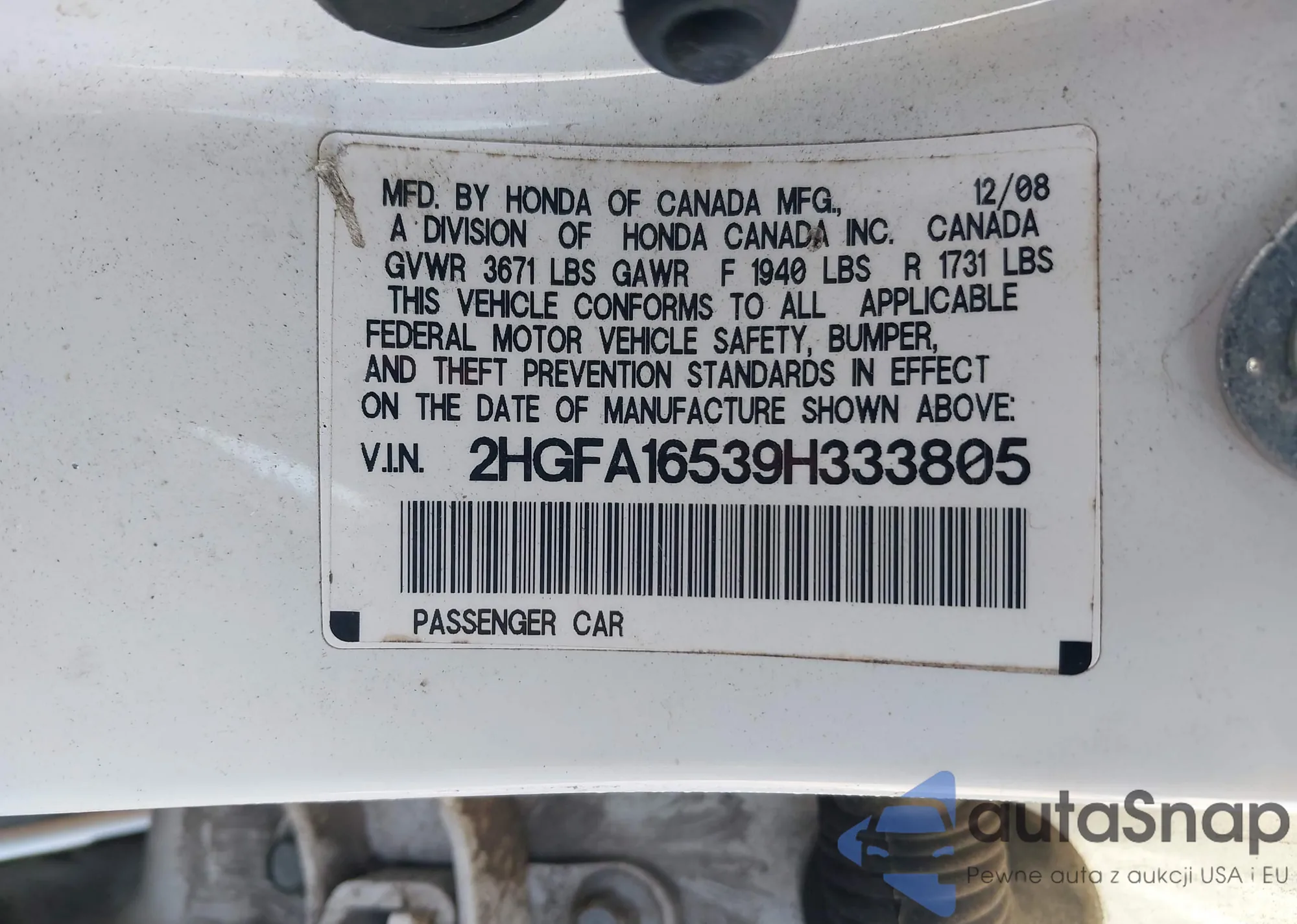 LOT: 43800379 VIN: 2HGFA16539H333805