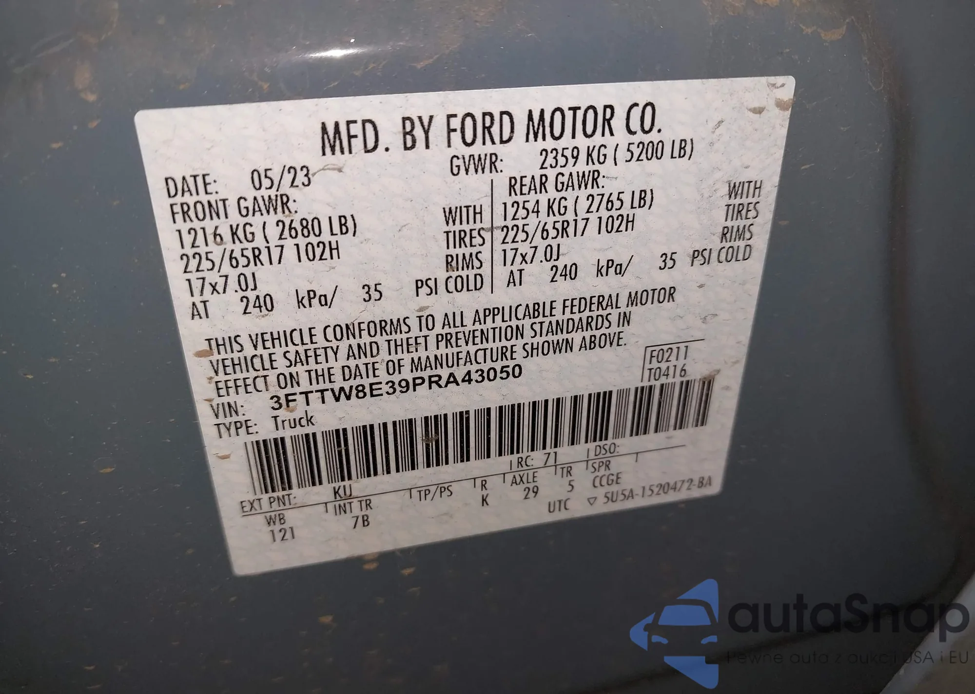 LOT: 43653120 VIN: 3FTTW8E39PRA43050