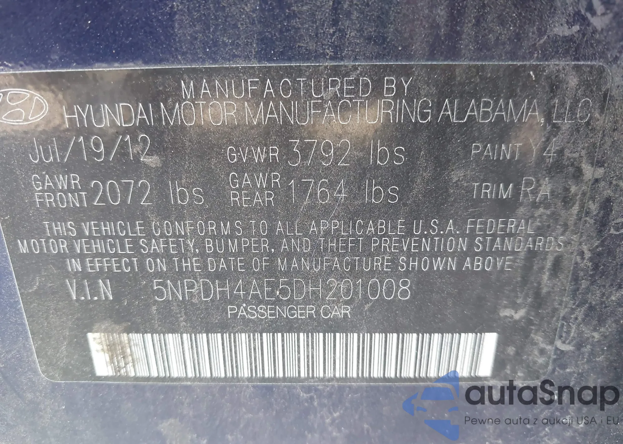 LOT: 43783718 VIN: 5NPDH4AE5DH201008