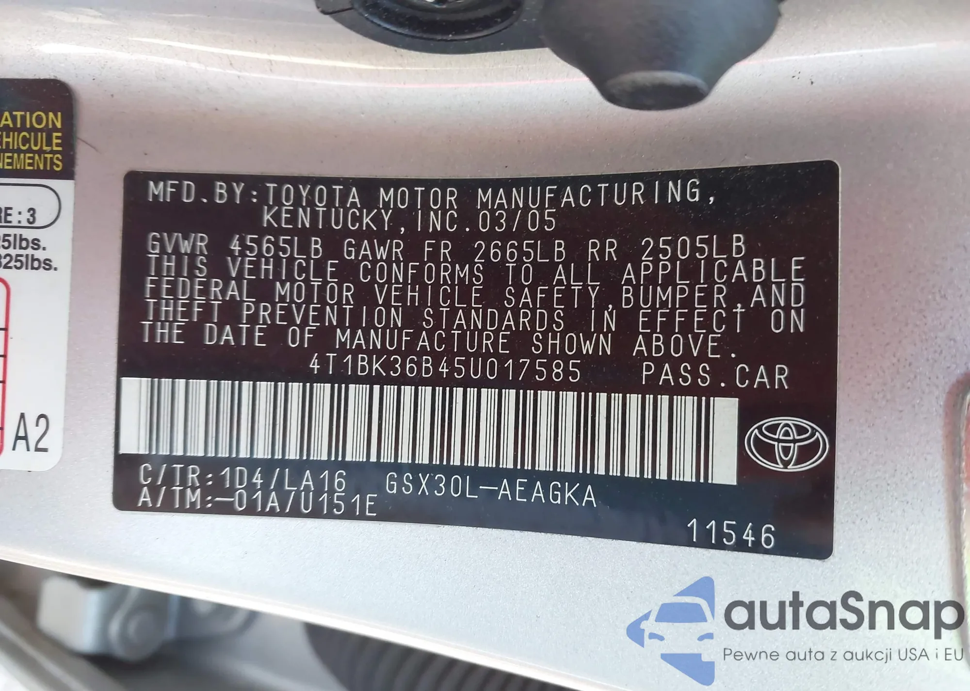 • VIN 4T1BK36B45U017585