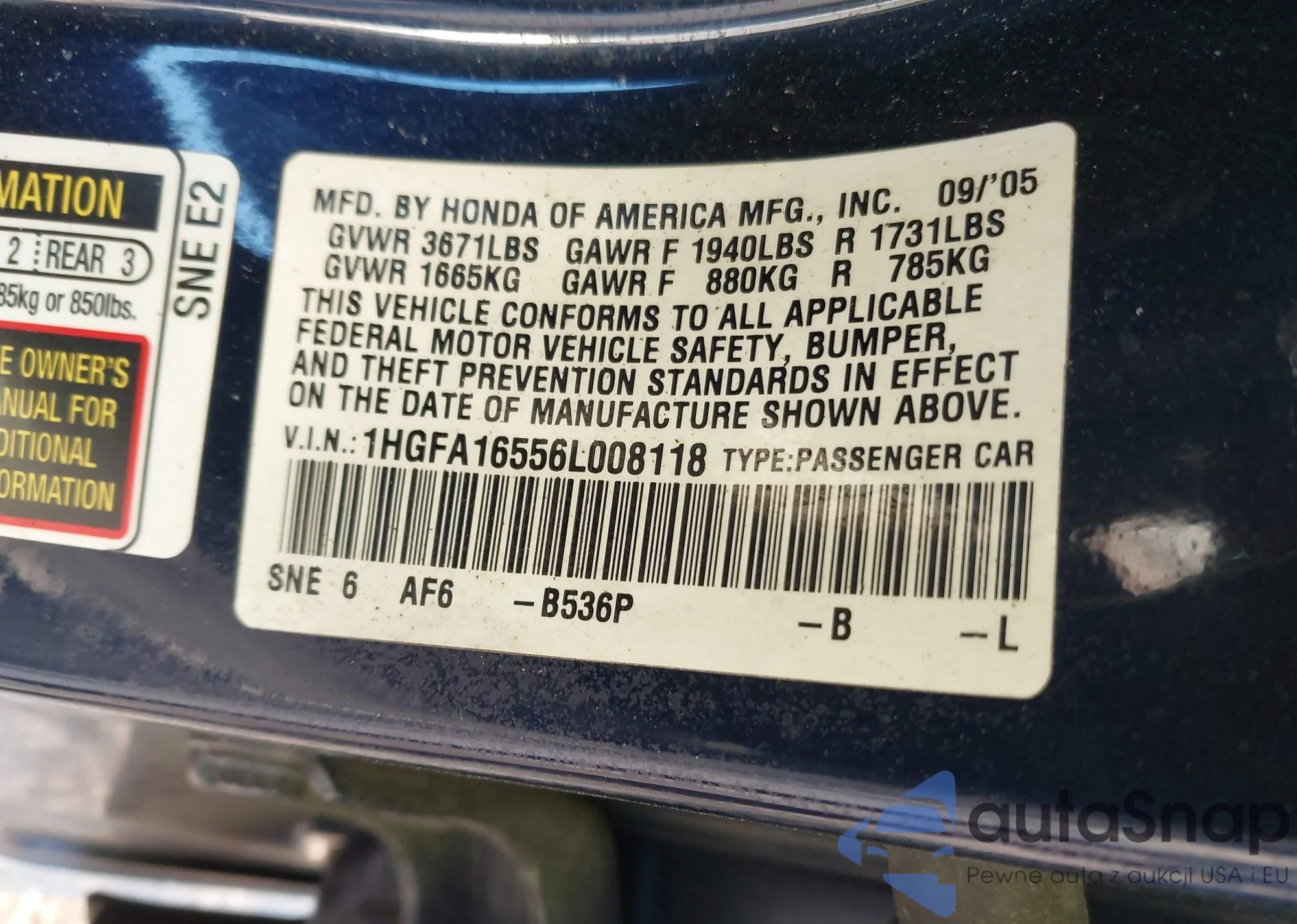 LOT: 41328675 VIN: 1HGFA16556L008118