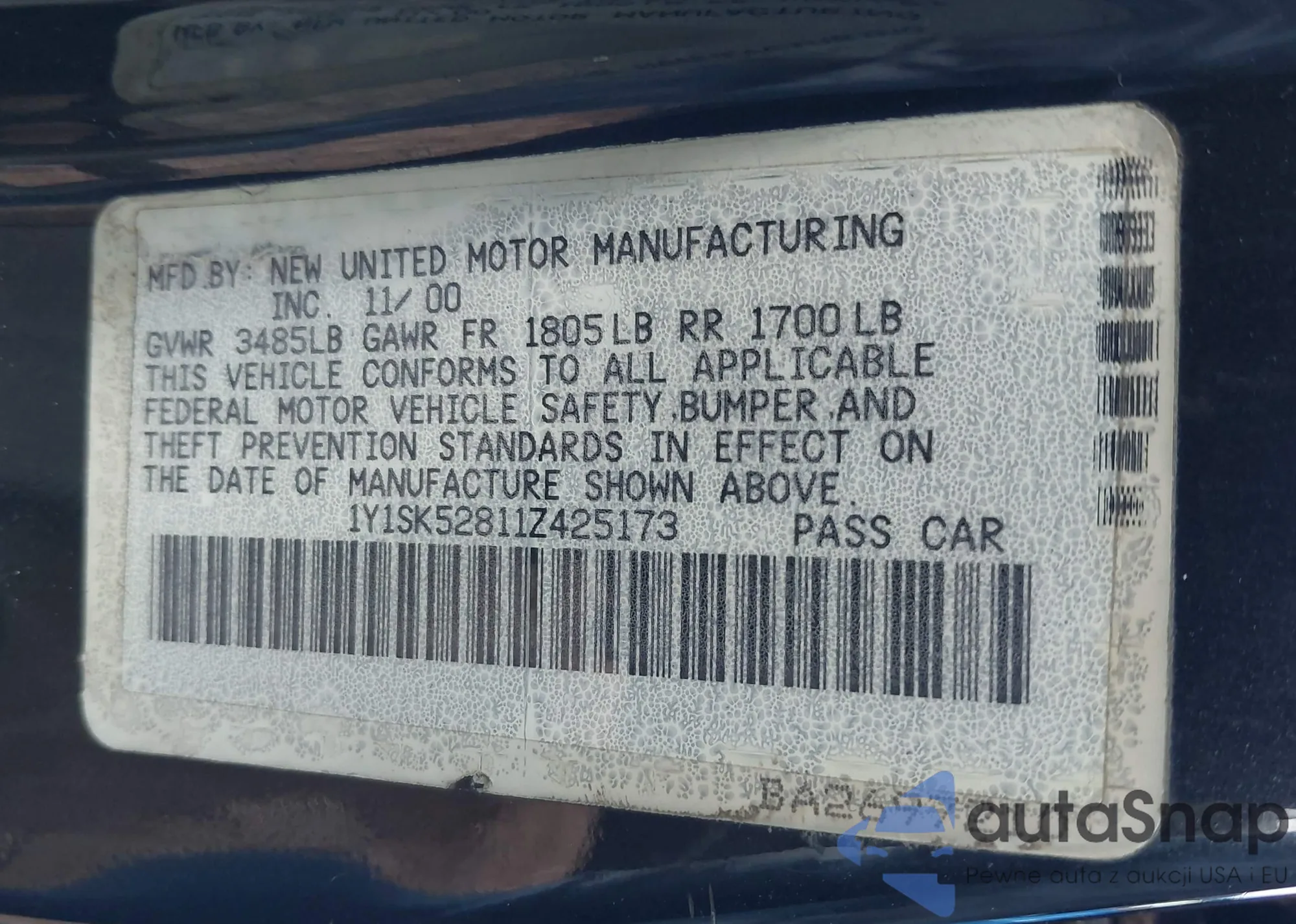 • VIN 1Y1SK52811Z425173