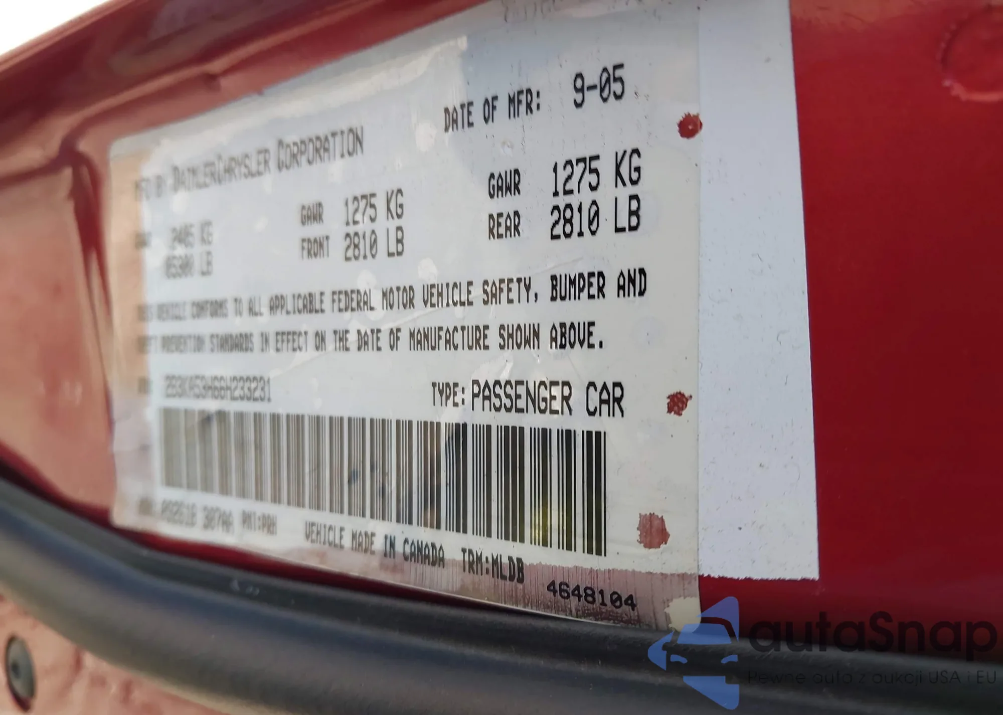 • VIN 2B3KA53H66H233231