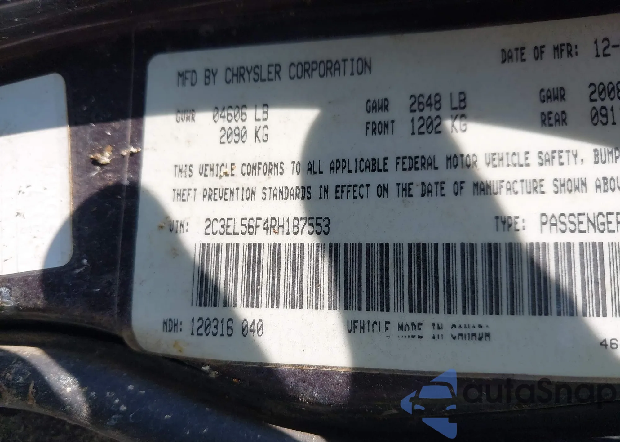 • VIN 2C3EL56F4RH187553