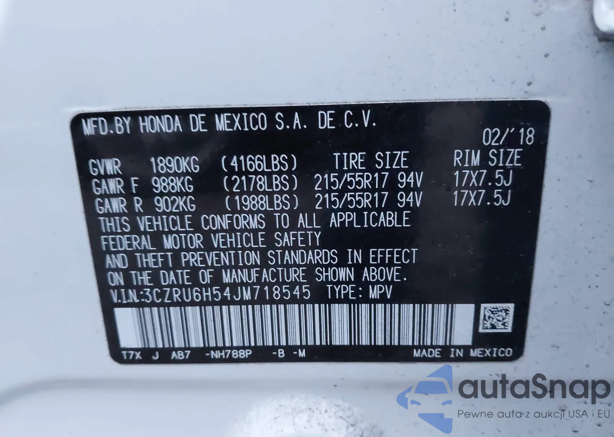 • VIN 3CZRU6H54JM718545