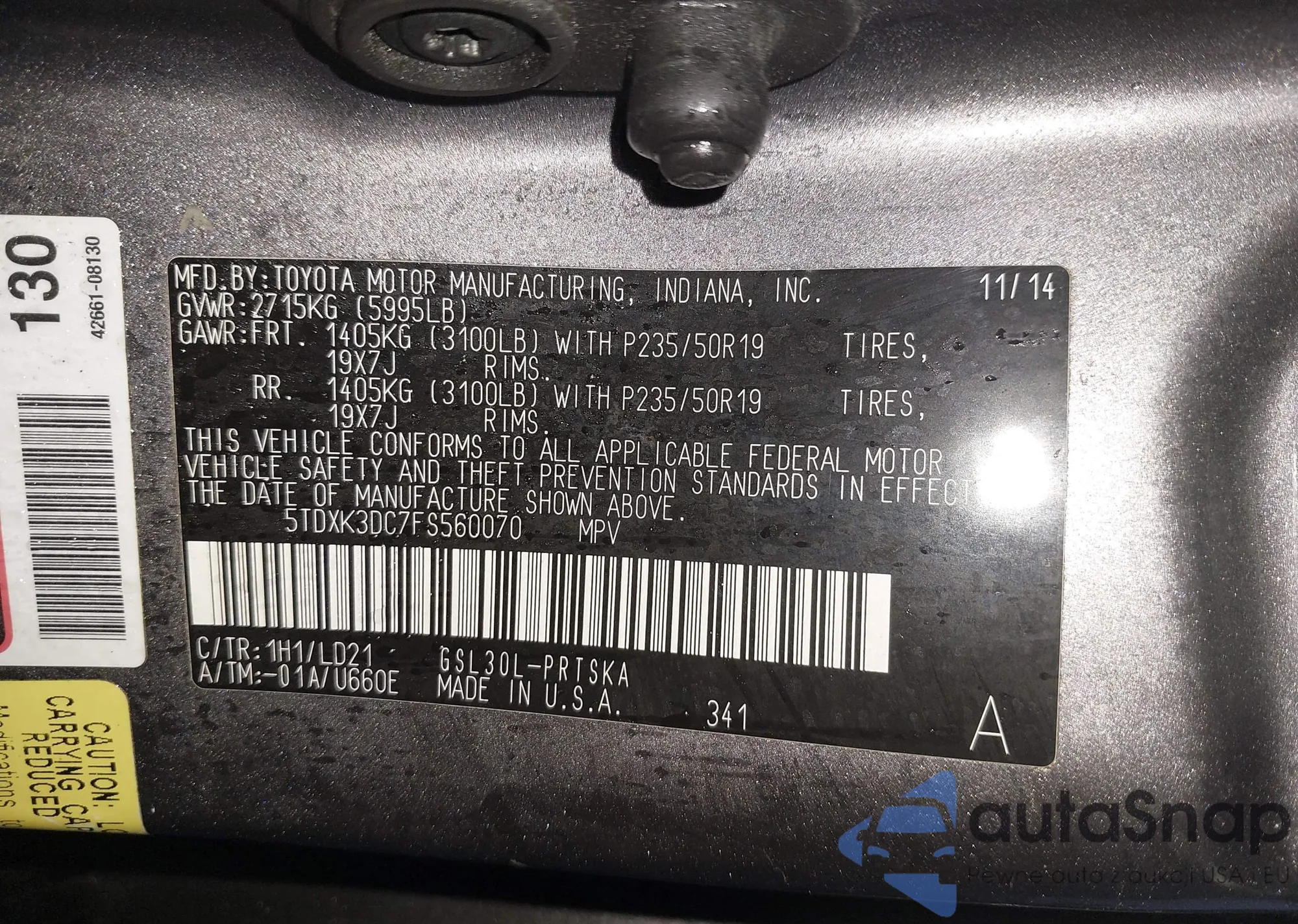 LOT: 43850654 VIN: 5TDXK3DC7FS560070