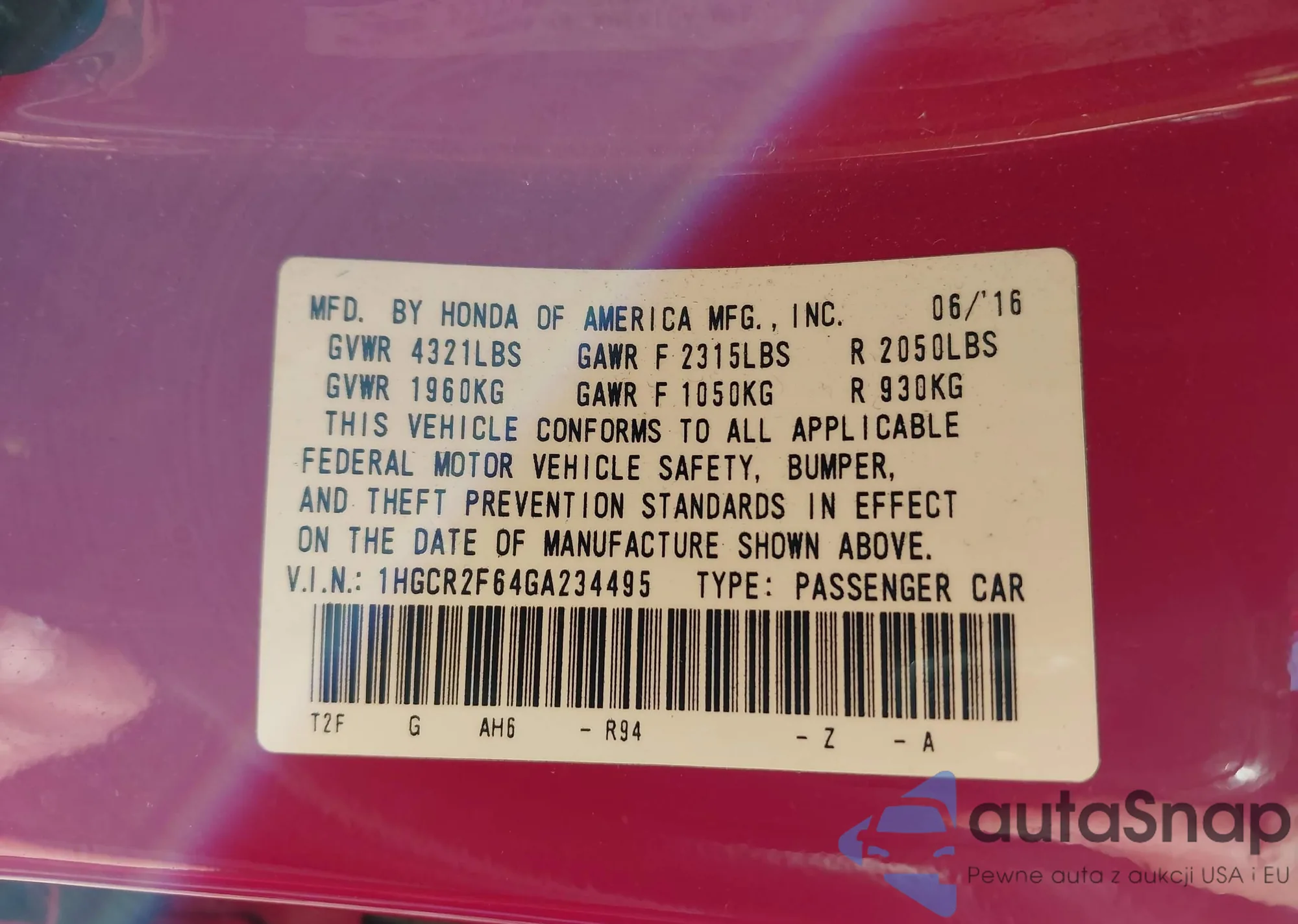 • VIN 1HGCR2F64GA234495
