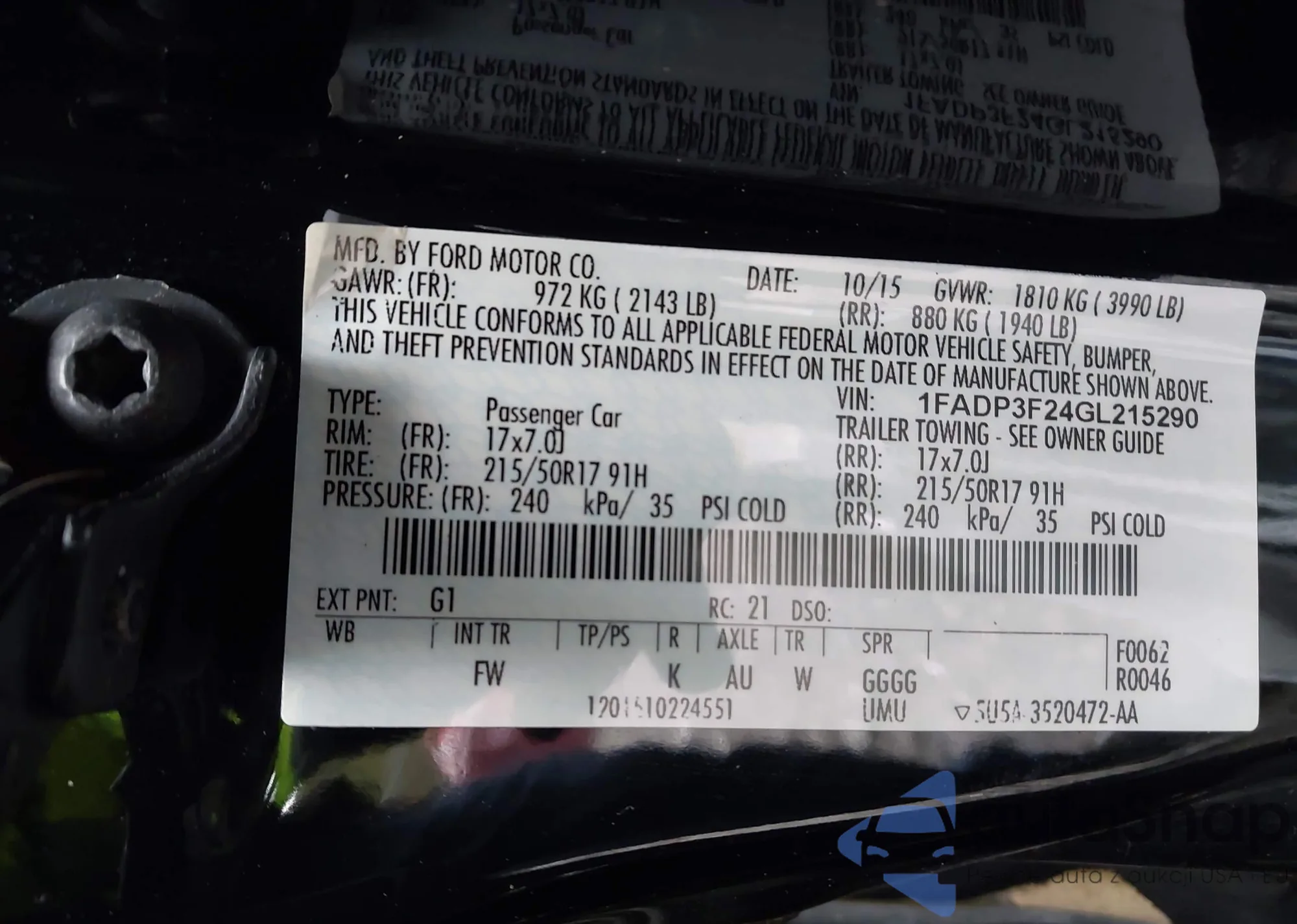 LOT: 43549702 VIN: 1FADP3F24GL215290