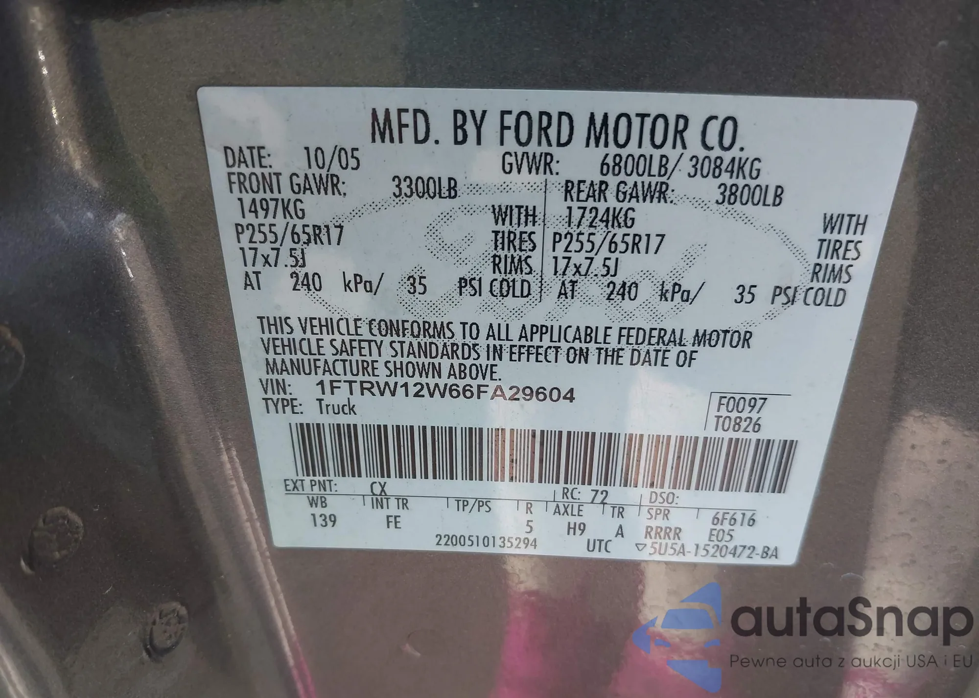 LOT: 43682328 VIN: 1FTRW12W66FA29604