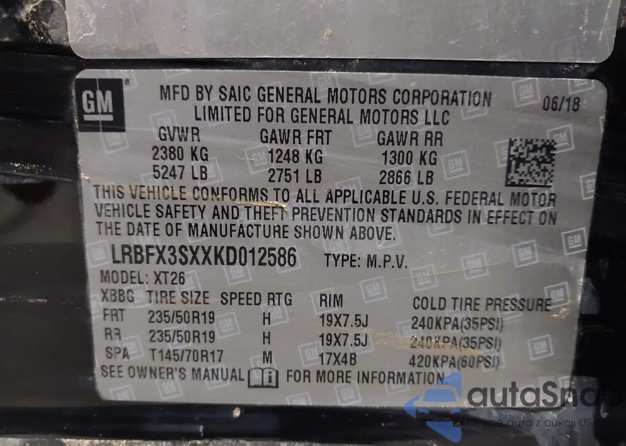 LOT: 43307964 VIN: LRBFX3SXXKD012586