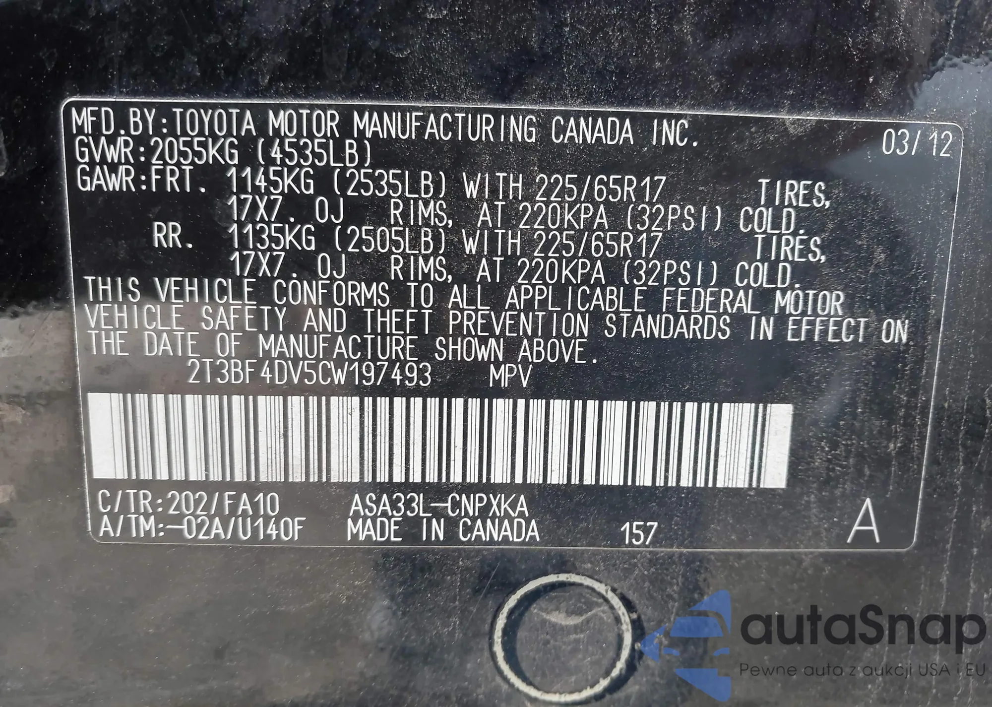 LOT: 43636905 VIN: 2T3BF4DV5CW197493