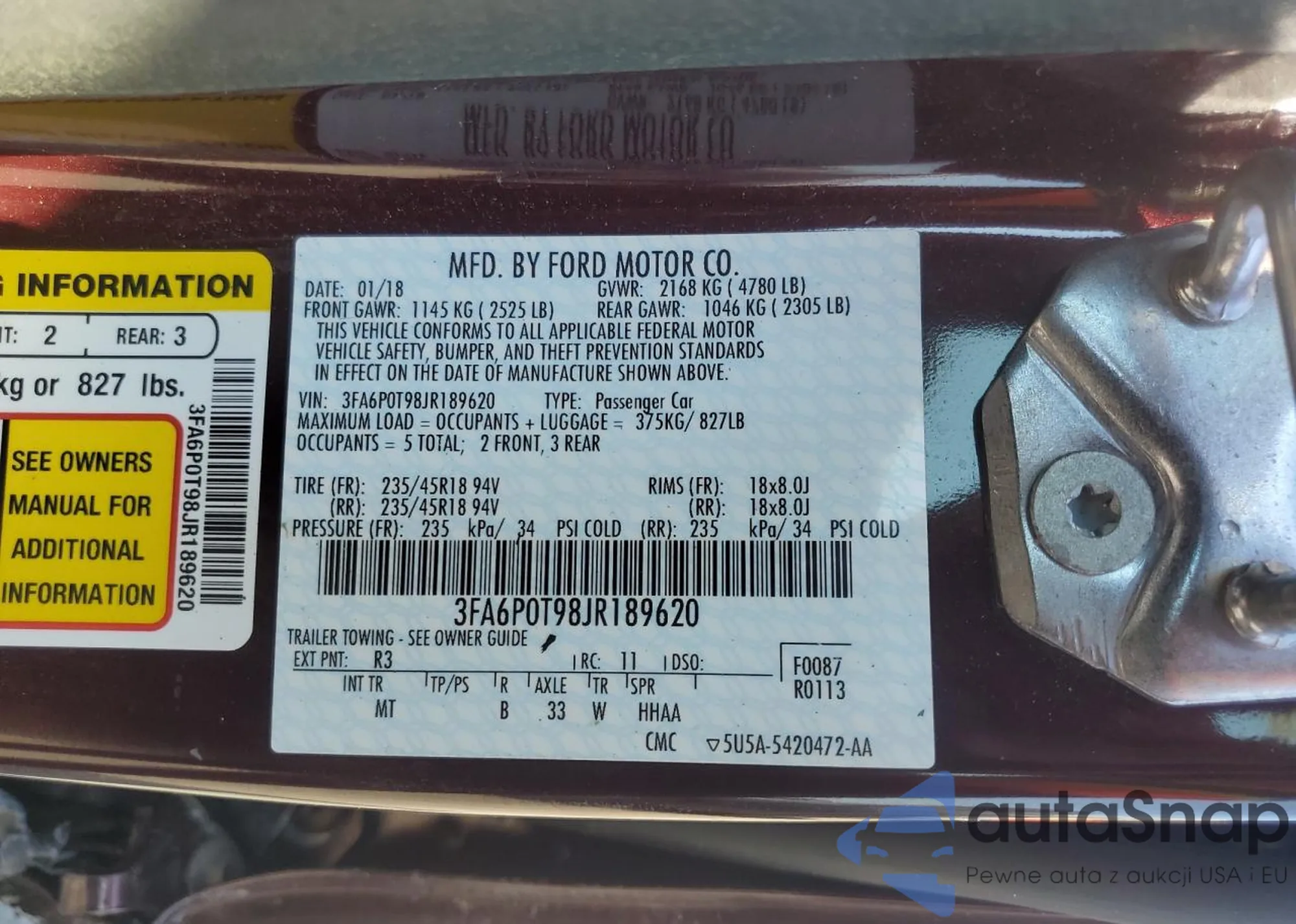 LOT: 80307255 VIN: 3FA6P0T98JR189620
