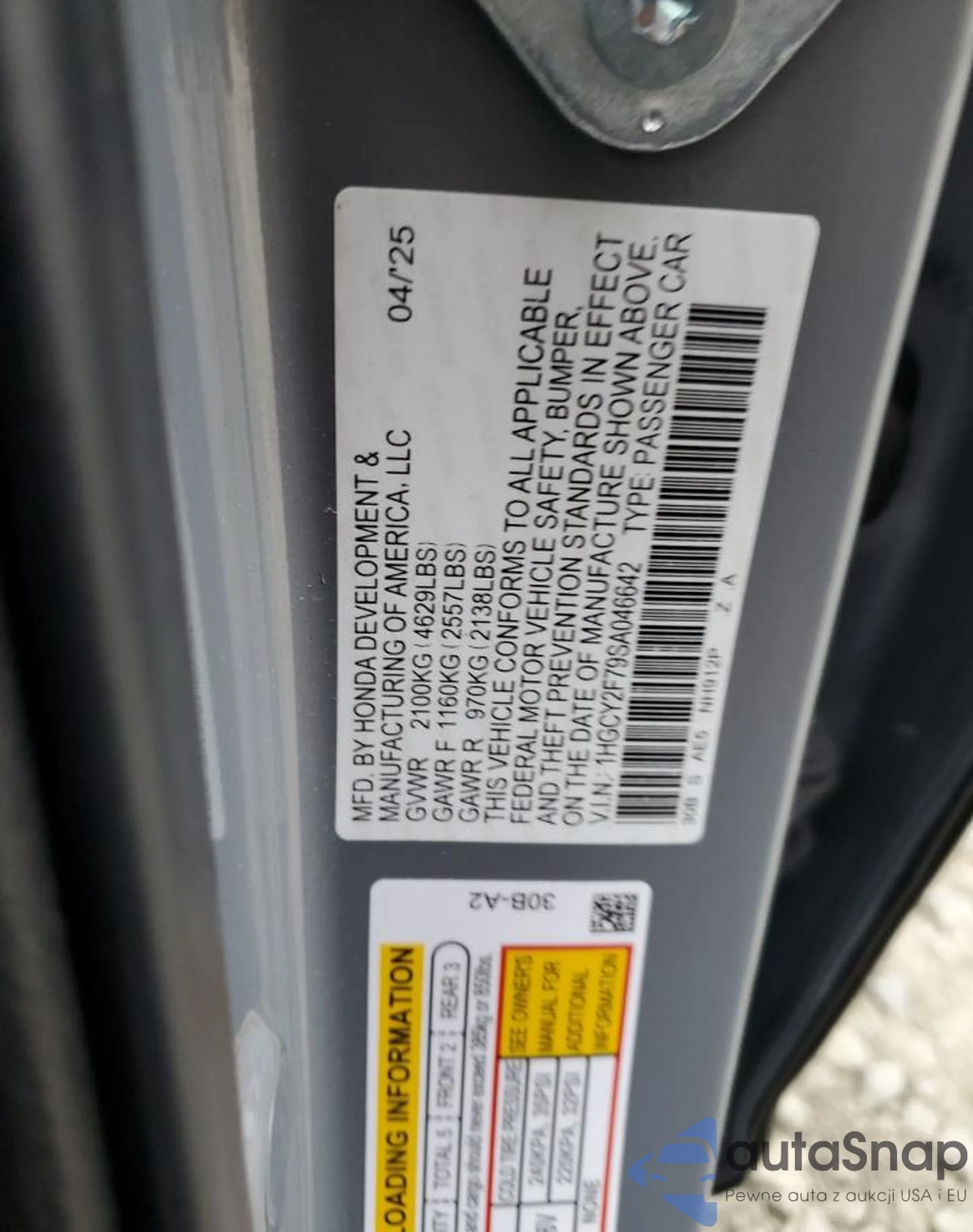 LOT: 90665765 VIN: 1HGCY2F79SA046642