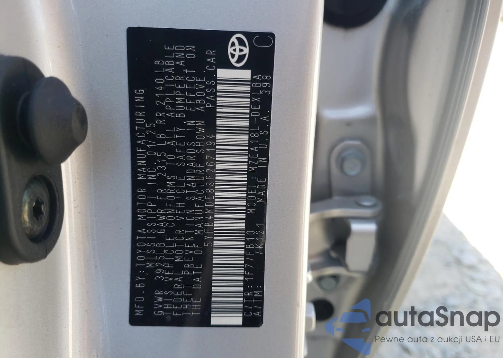 • VIN 5YFB4MDE8SP267194