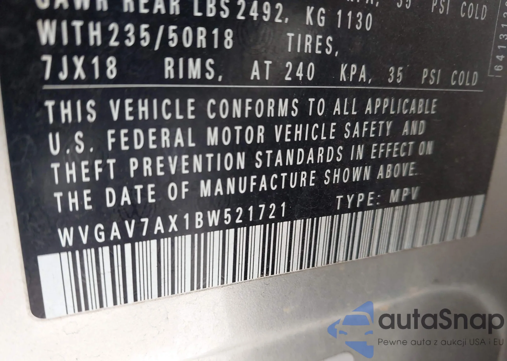 LOT: 43777608 VIN: WVGAV7AX1BW521721