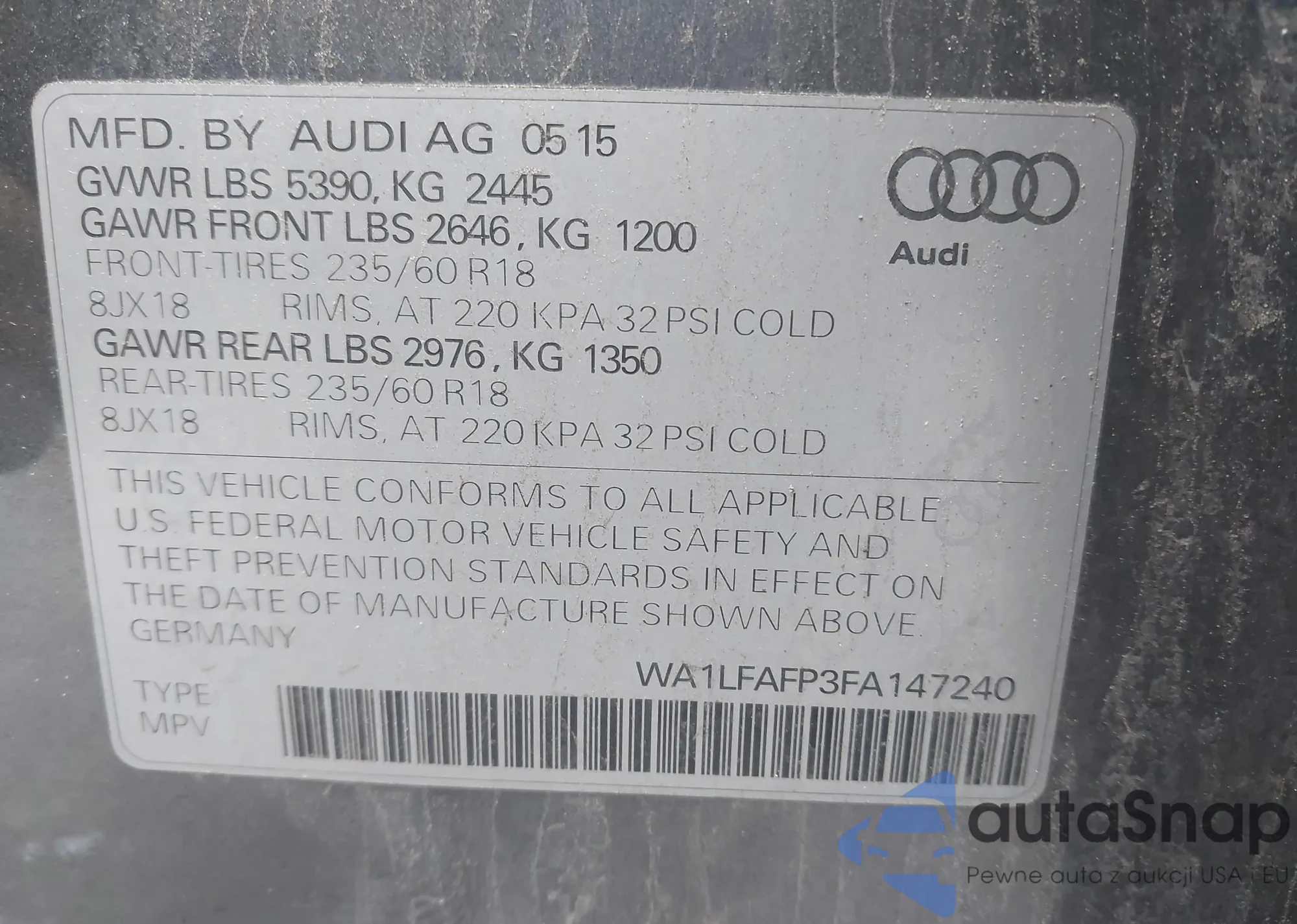 LOT: 43828914 VIN: WA1LFAFP3FA147240