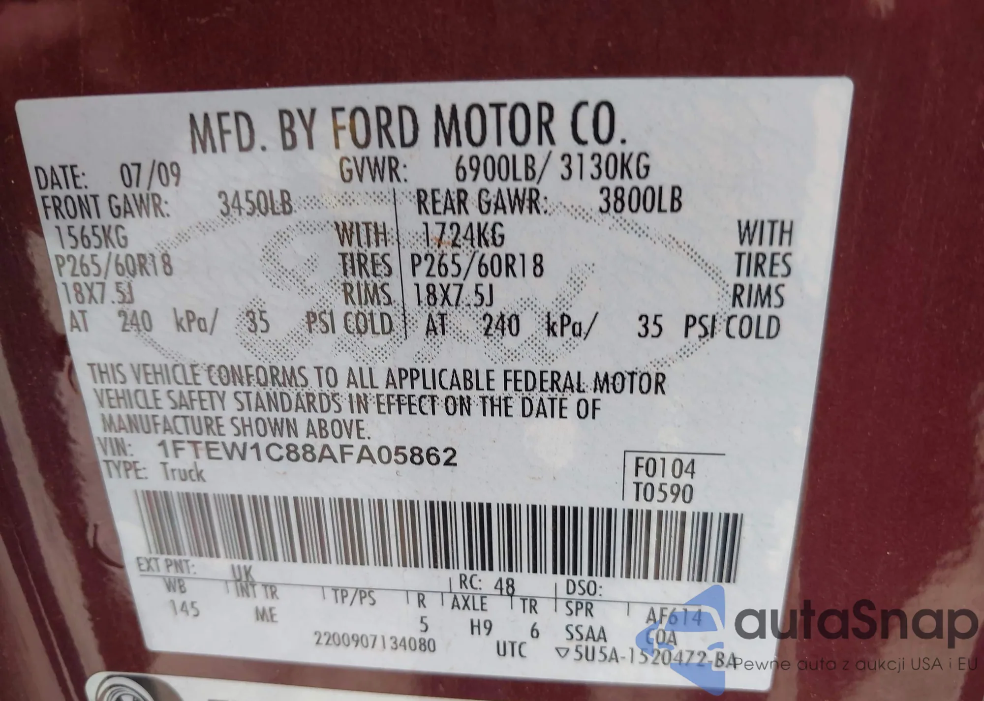 • VIN 1FTEW1C88AFA05862
