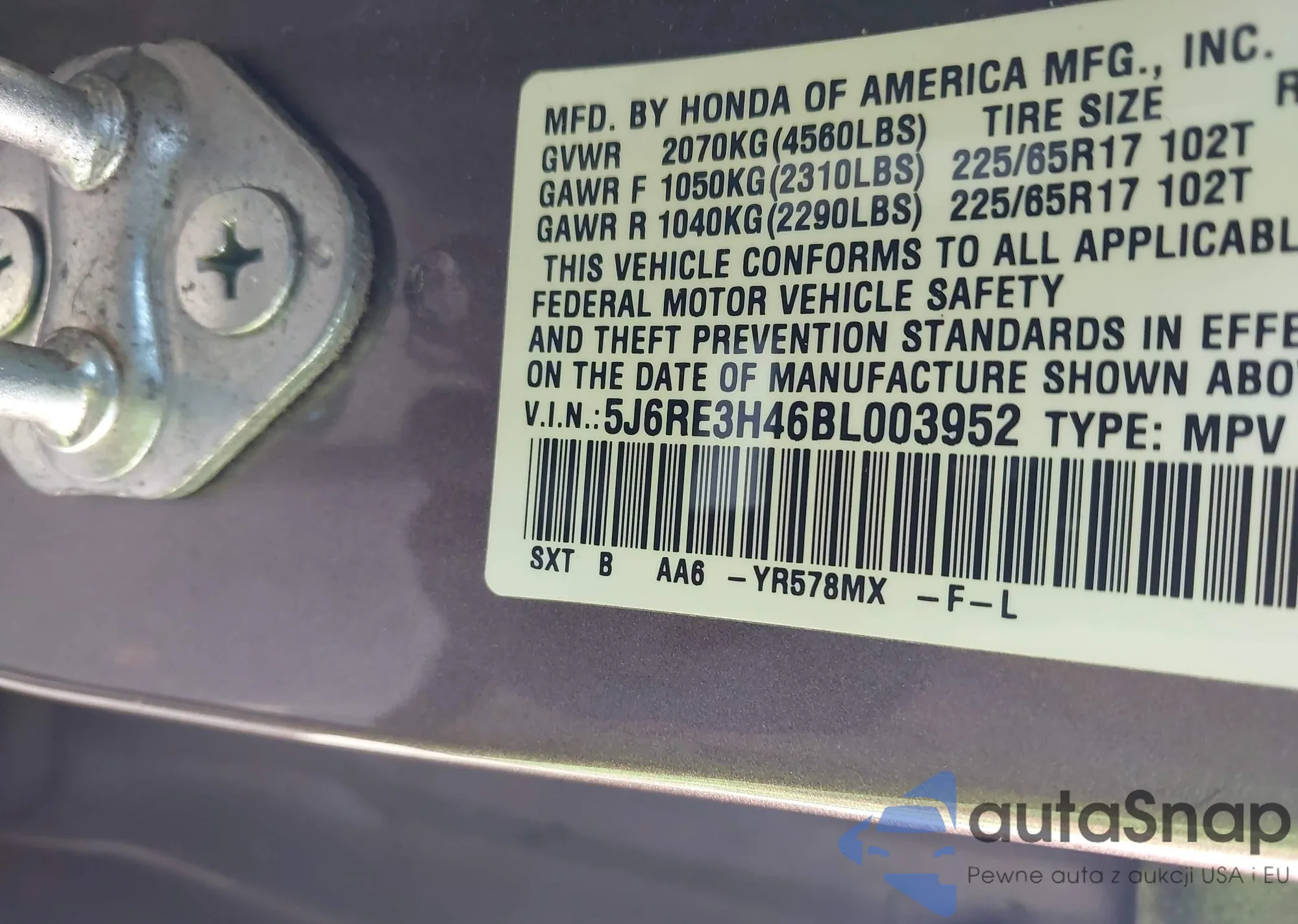 • VIN 5J6RE3H46BL003952