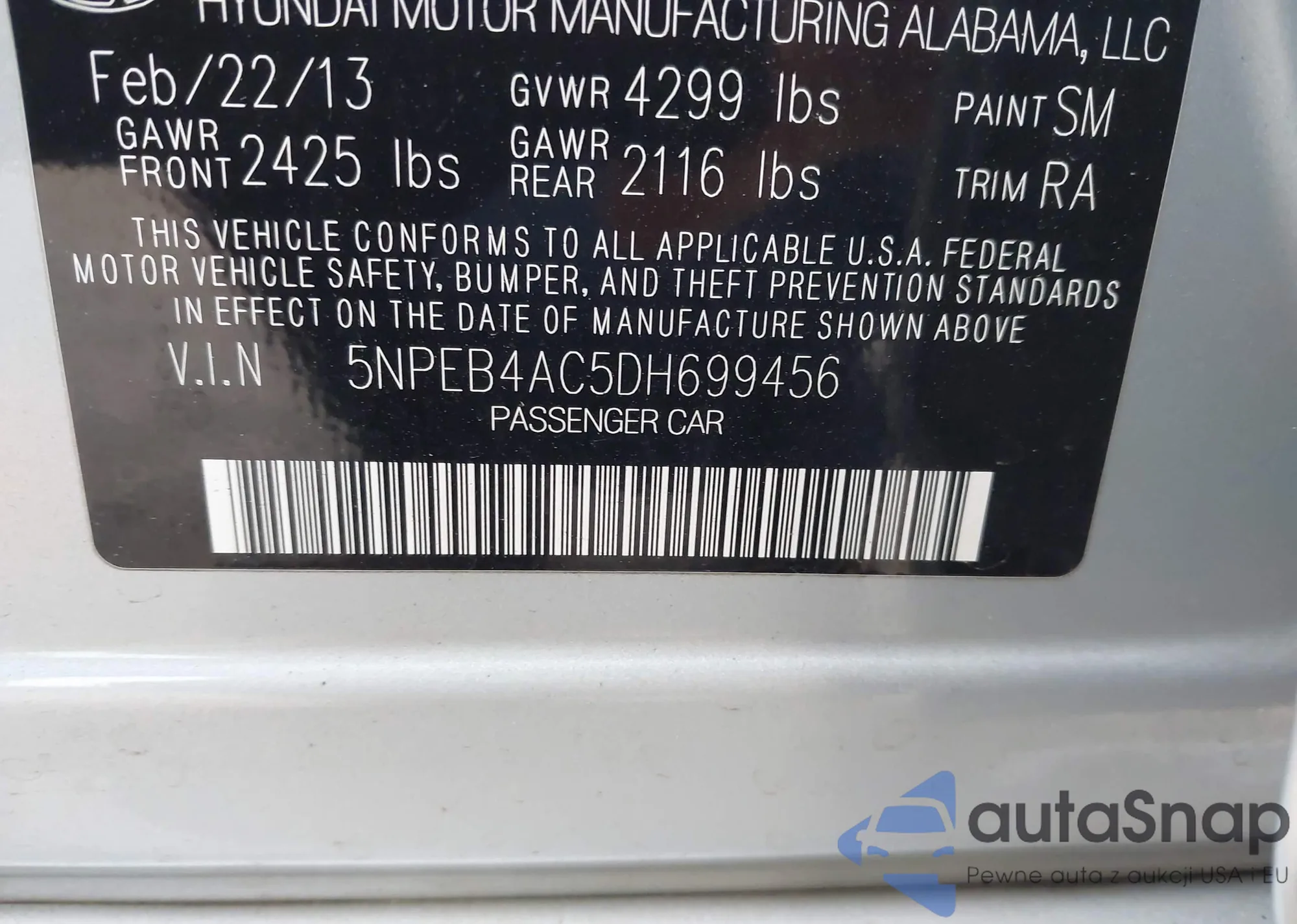• VIN 5NPEB4AC5DH699456