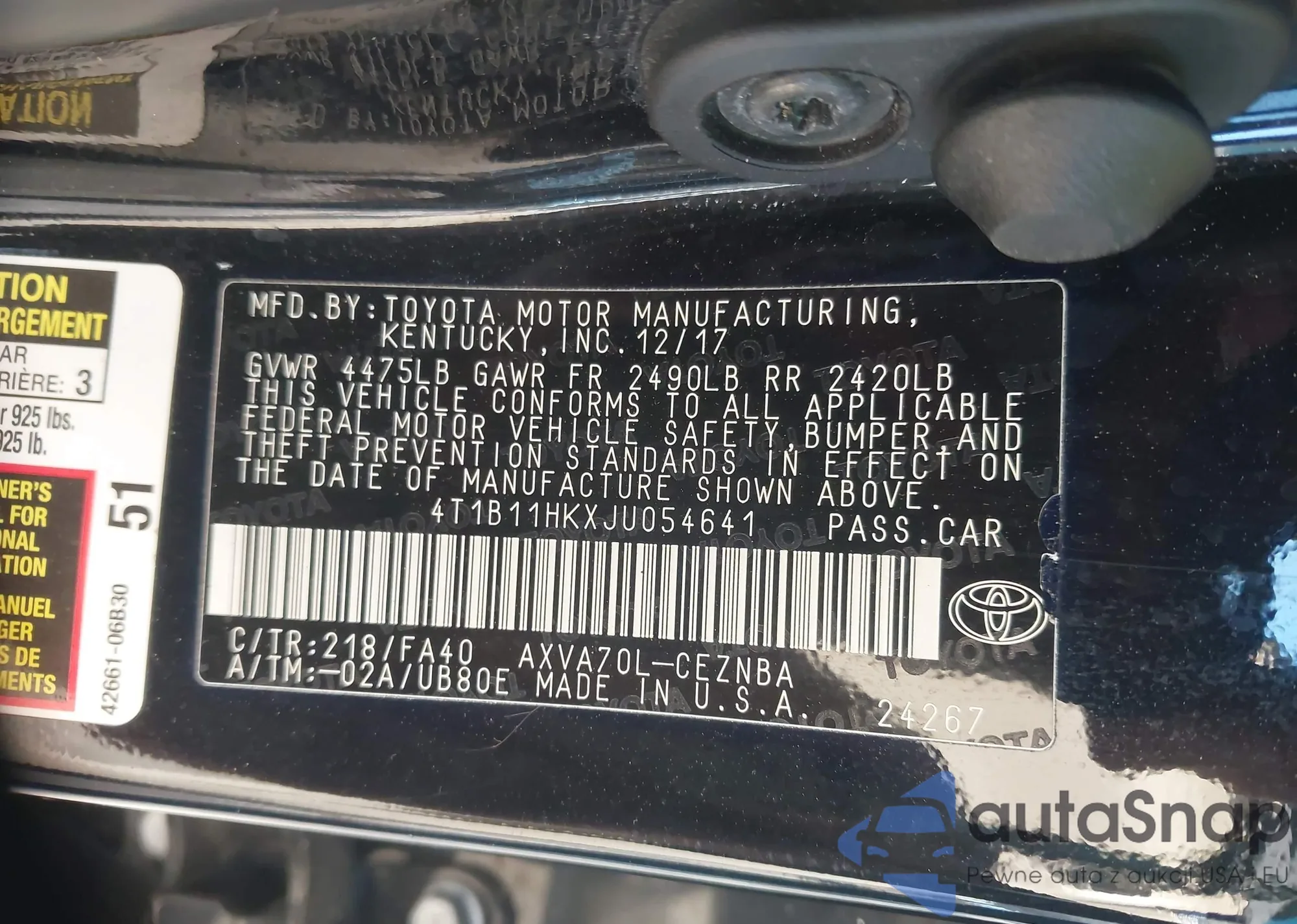 LOT: 43617506 VIN: 4T1B11HKXJU054641