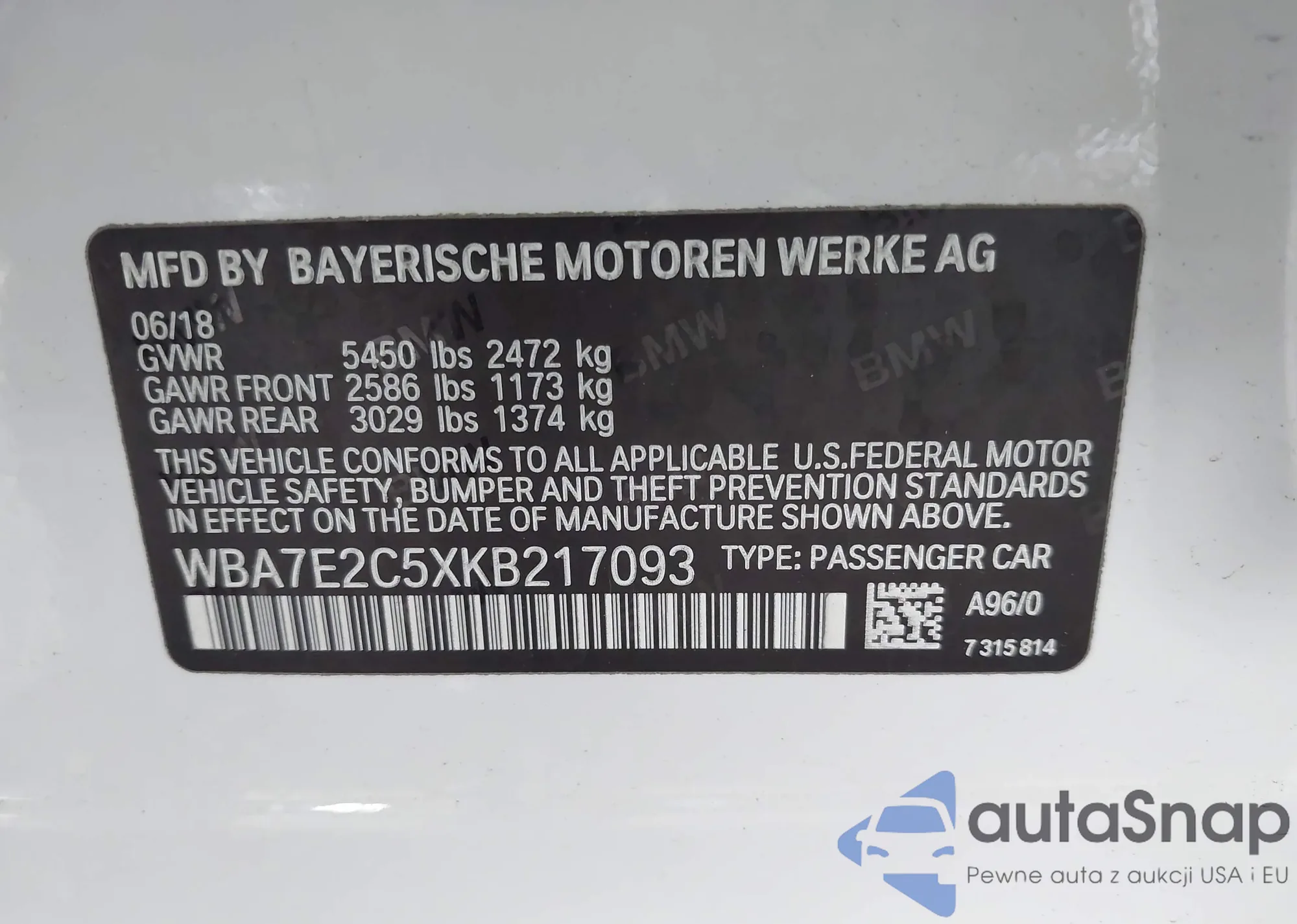 LOT: 42867238 VIN: WBA7E2C5XKB217093