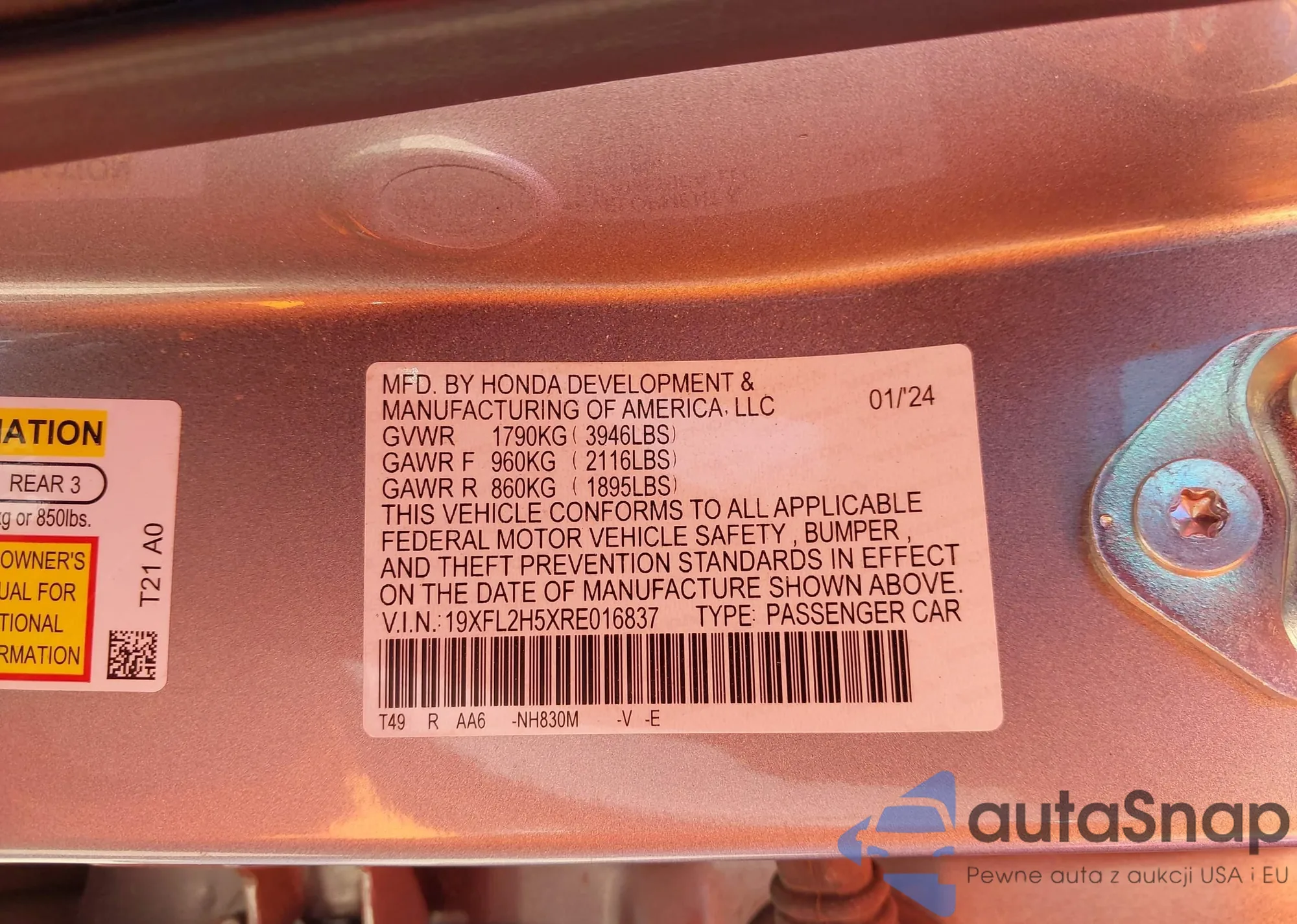 • VIN 19XFL2H5XRE016837