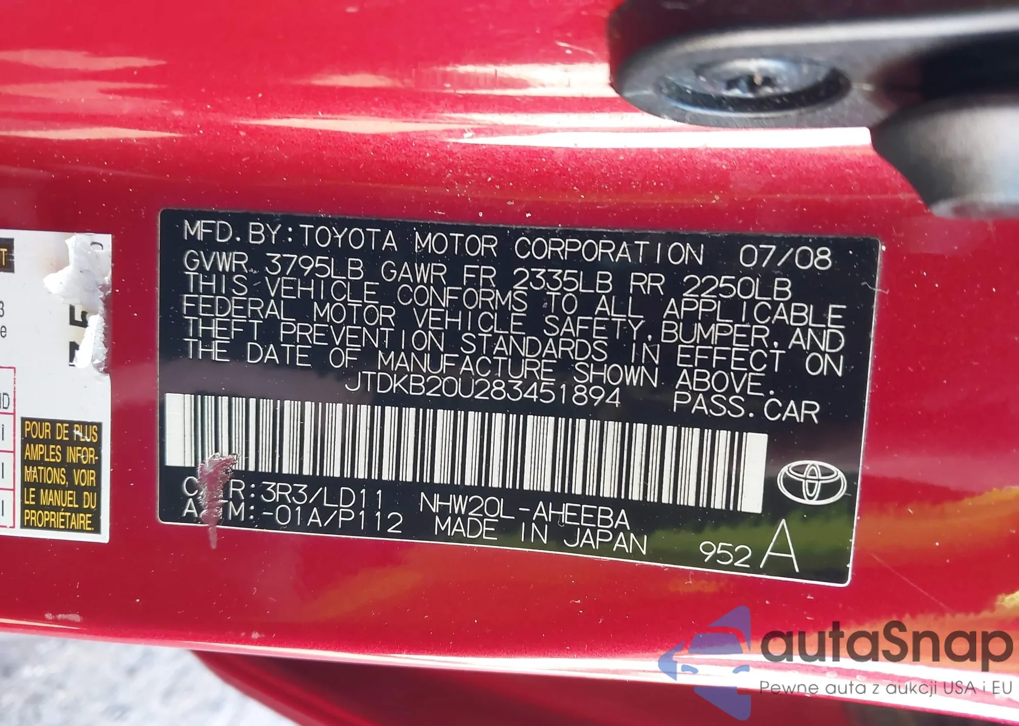LOT: 43934467 VIN: JTDKB20U283451894