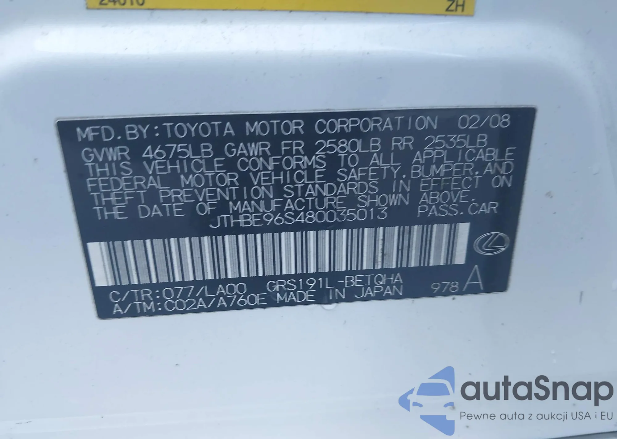 LOT: 43864277 VIN: 1NXBR32E35Z404673