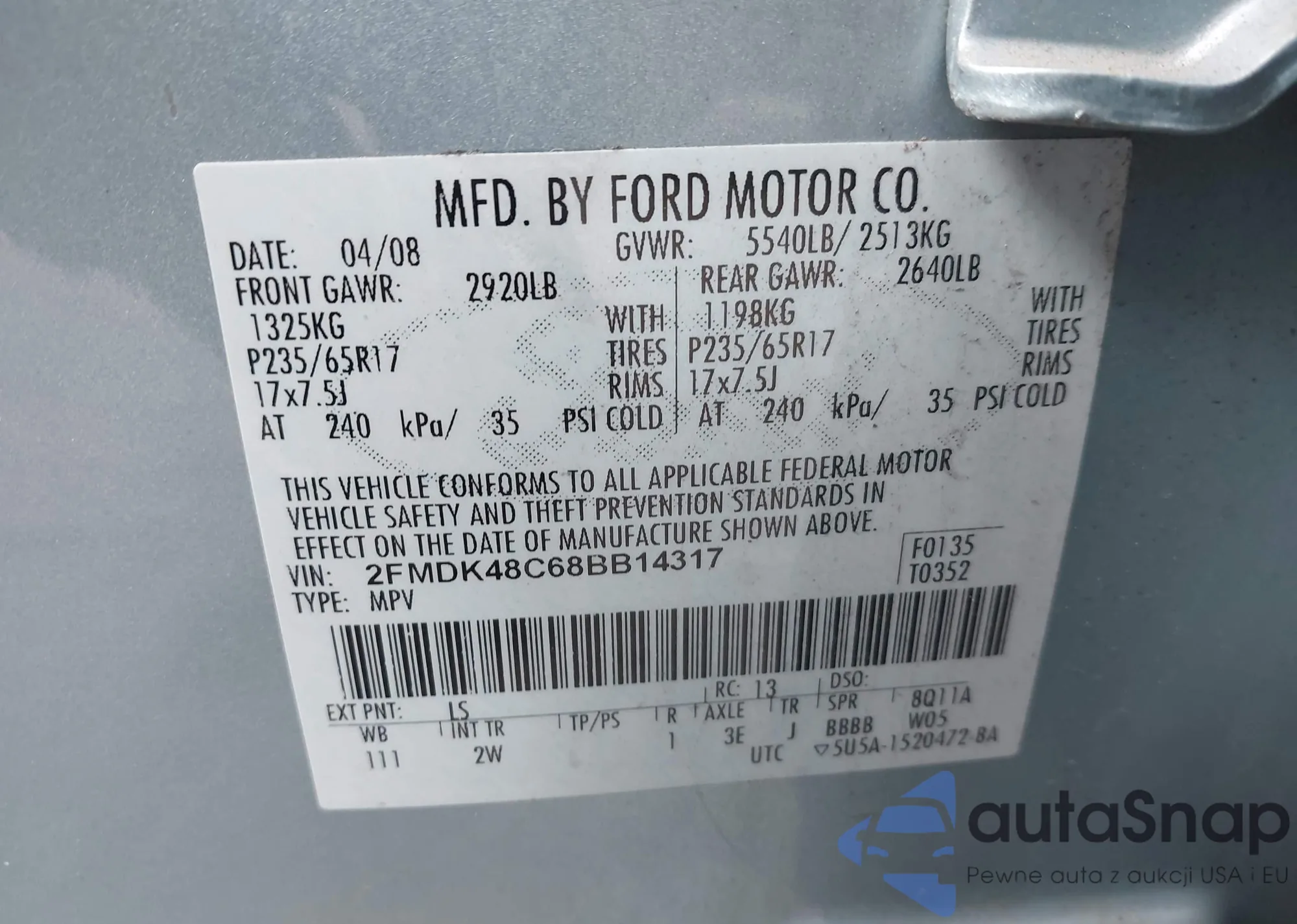 • VIN 2FMDK48C68BB14317