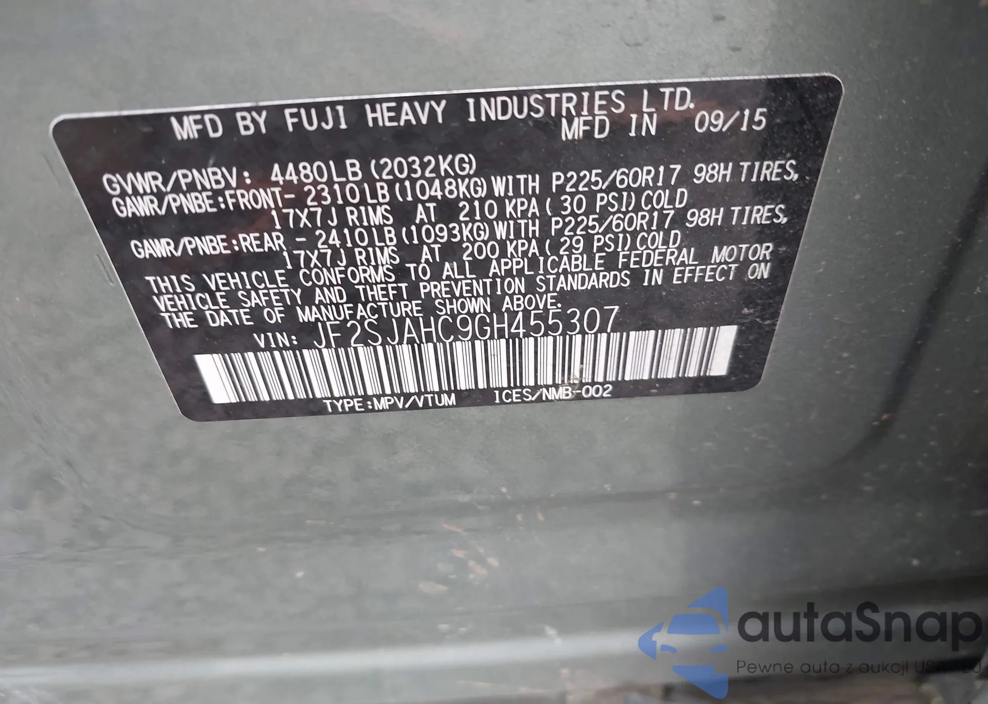 LOT: 43051725 VIN: JF2SJAHC9GH455307