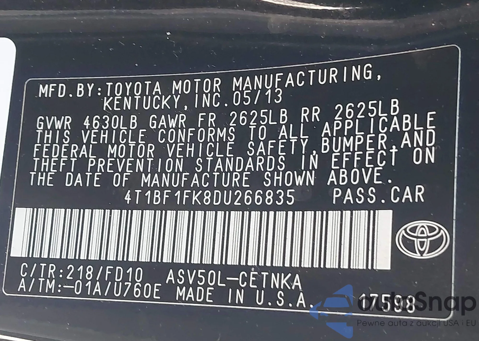 LOT: 43426038 VIN: 4T1BF1FK8DU266835