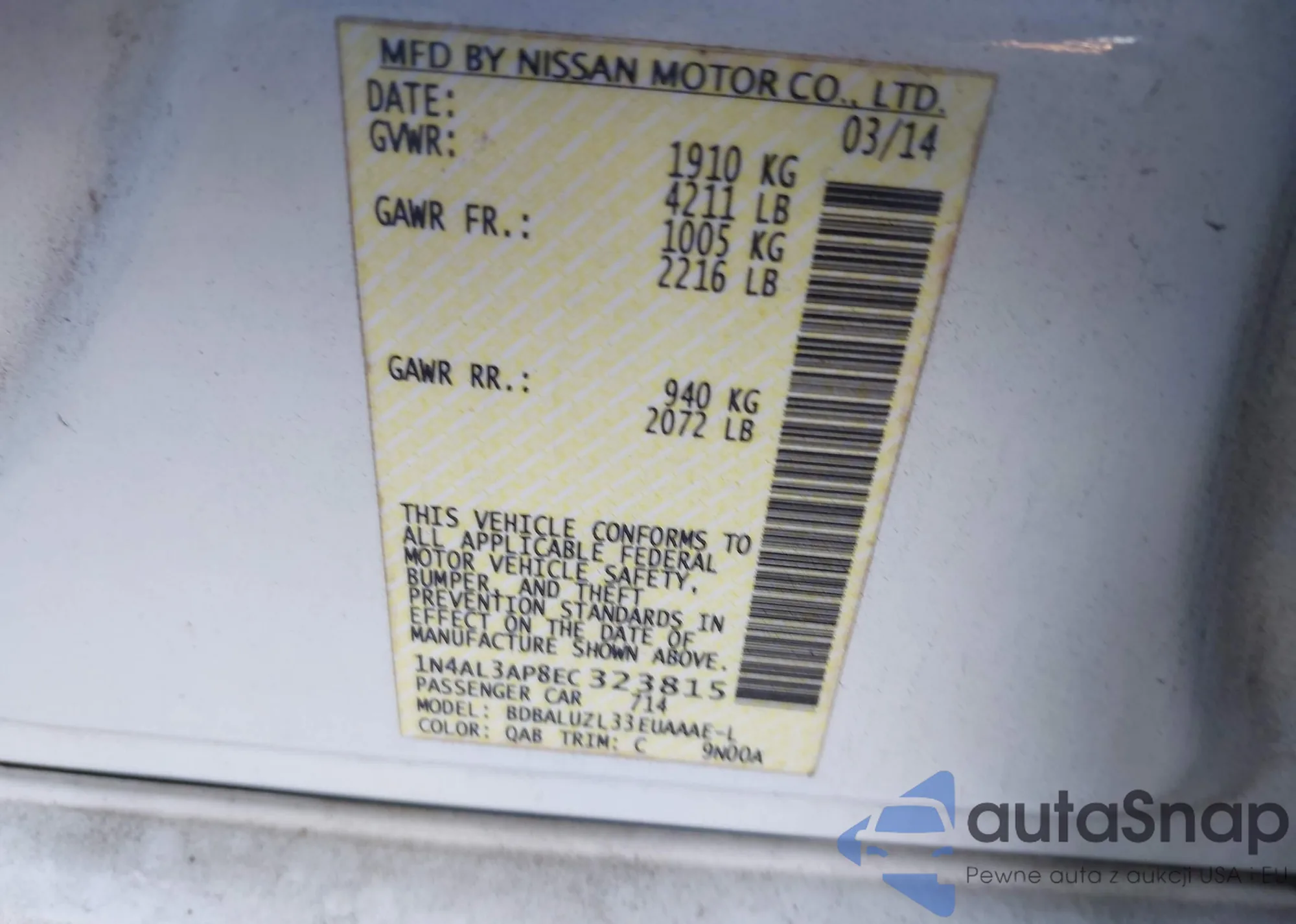 • VIN 1N4AL3AP8EC323815