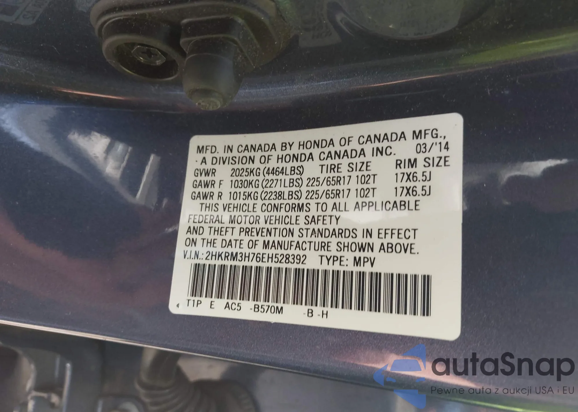 • VIN 2HKRM3H76EH528392
