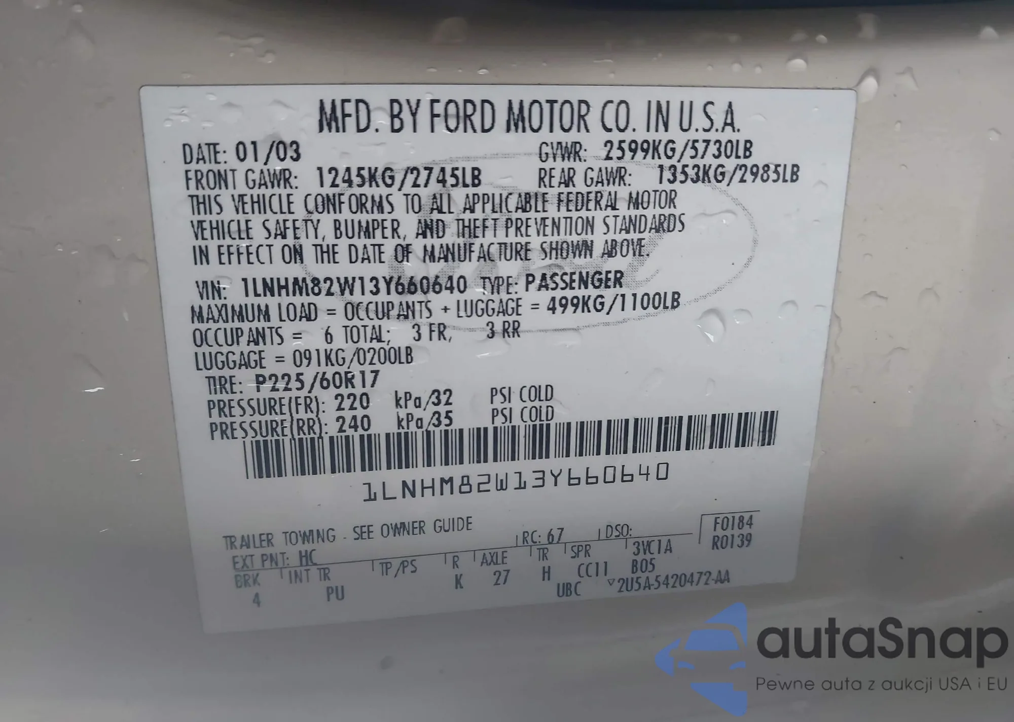 LOT: 43752384 VIN: 1LNHM82W13Y660640