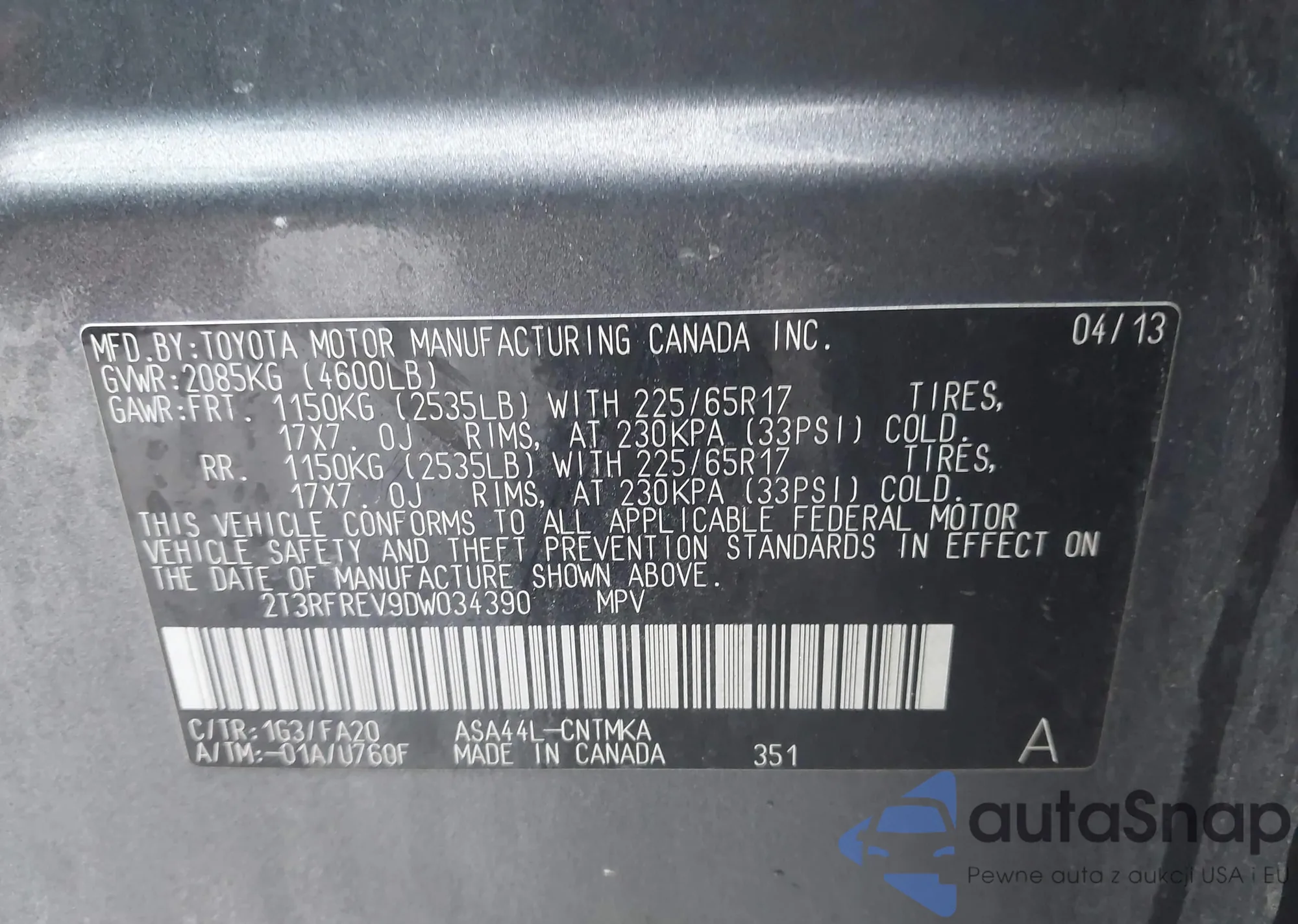 LOT: 43959809 VIN: 2T3RFREV9DW034390