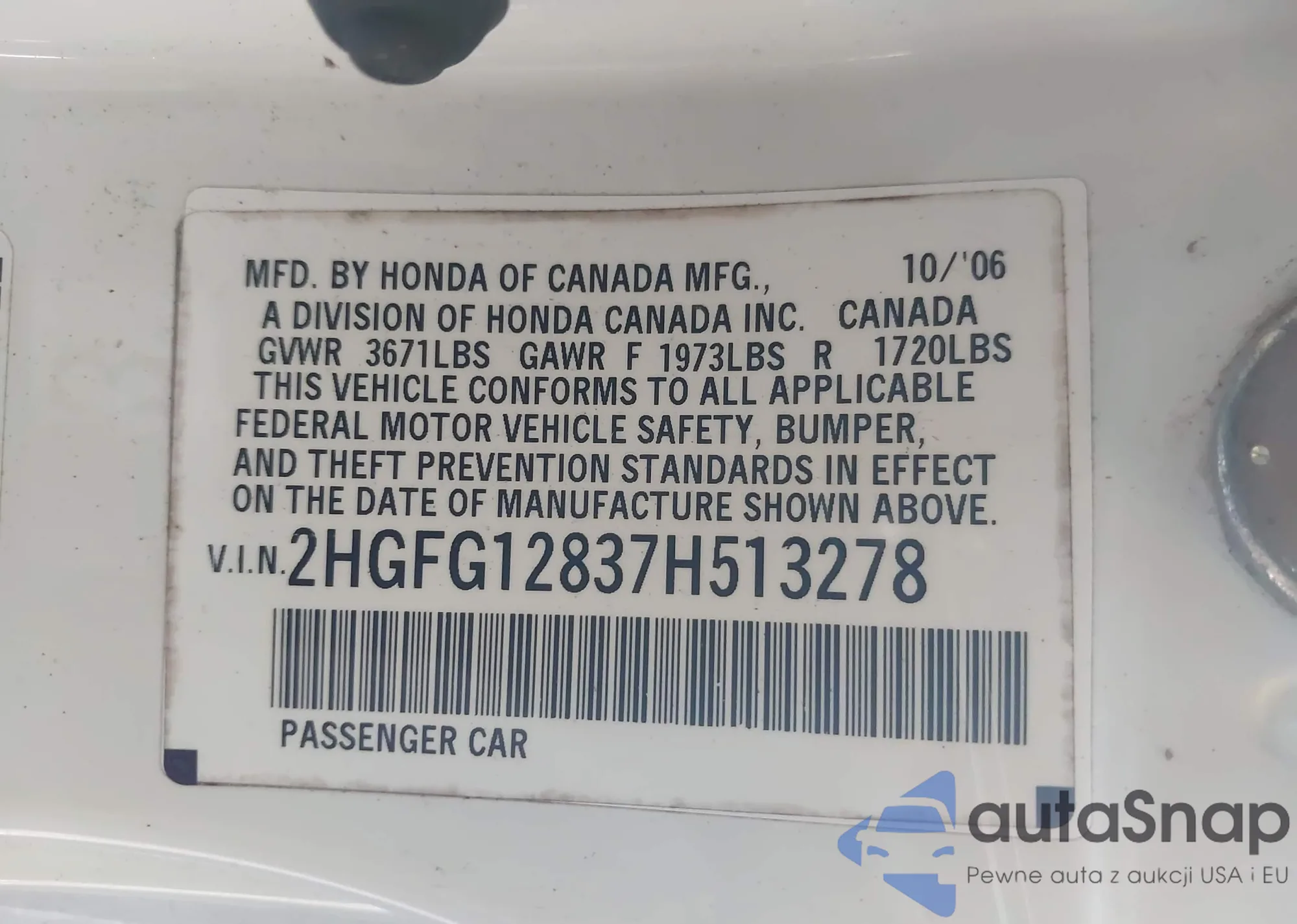LOT: 43591177 VIN: 2HGFG12837H513278