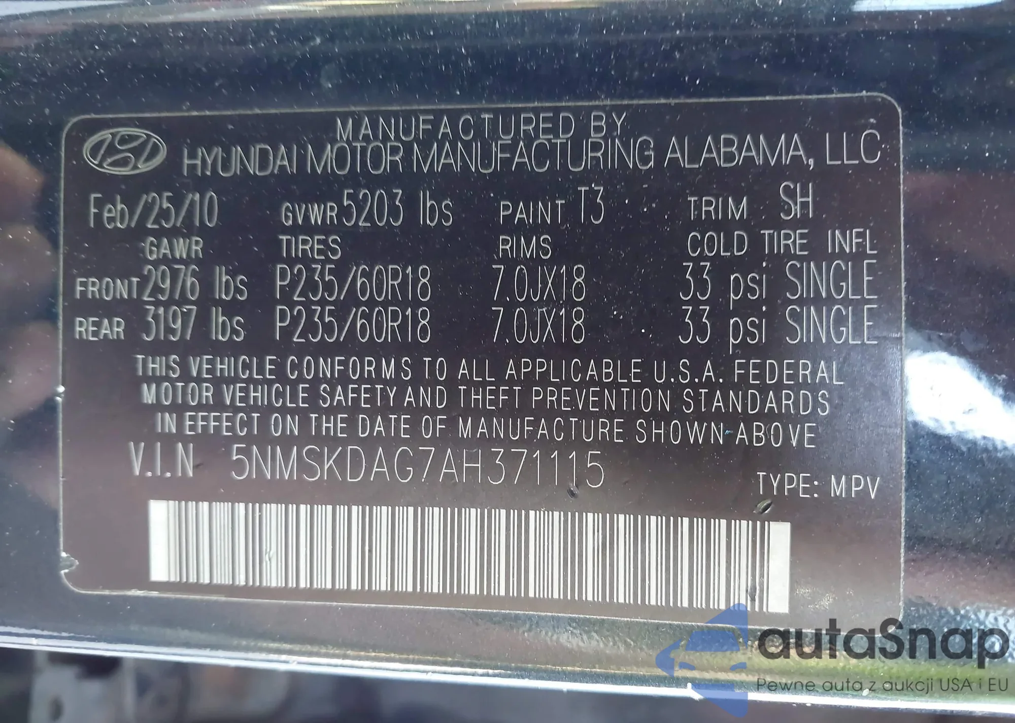 • VIN 5NMSKDAG7AH371115