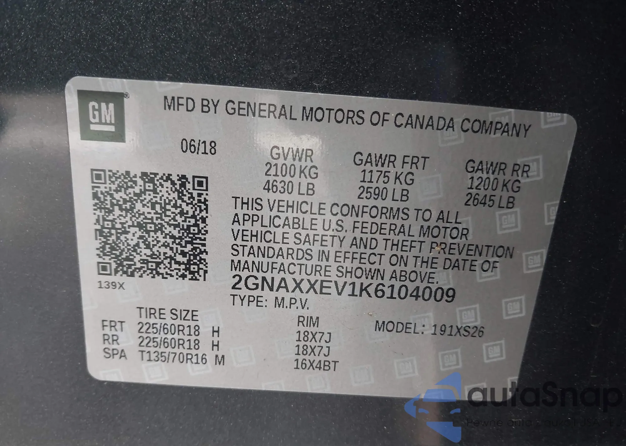 • VIN 2GNAXXEV1K6104009