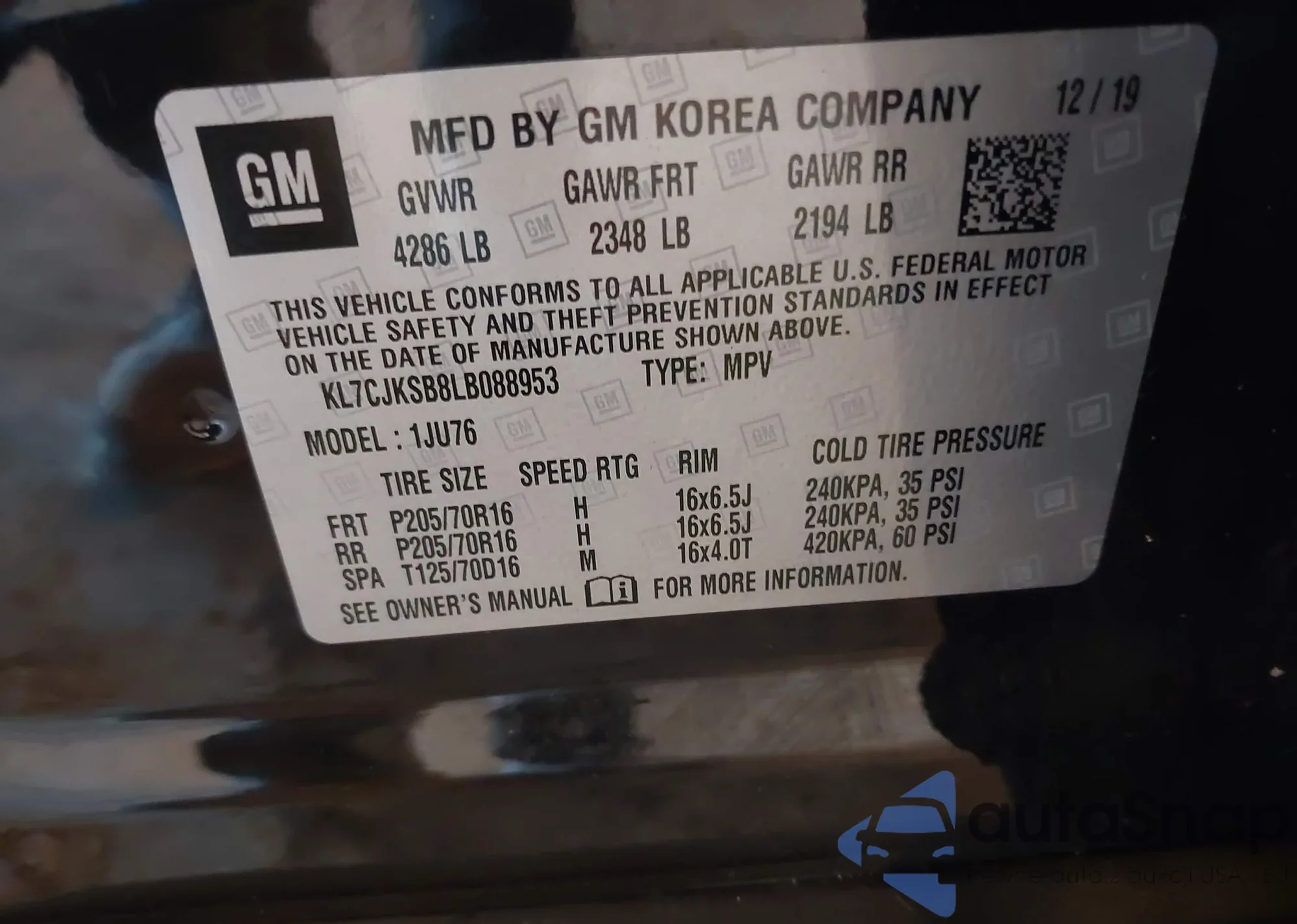 • VIN KL7CJKSB8LB088953