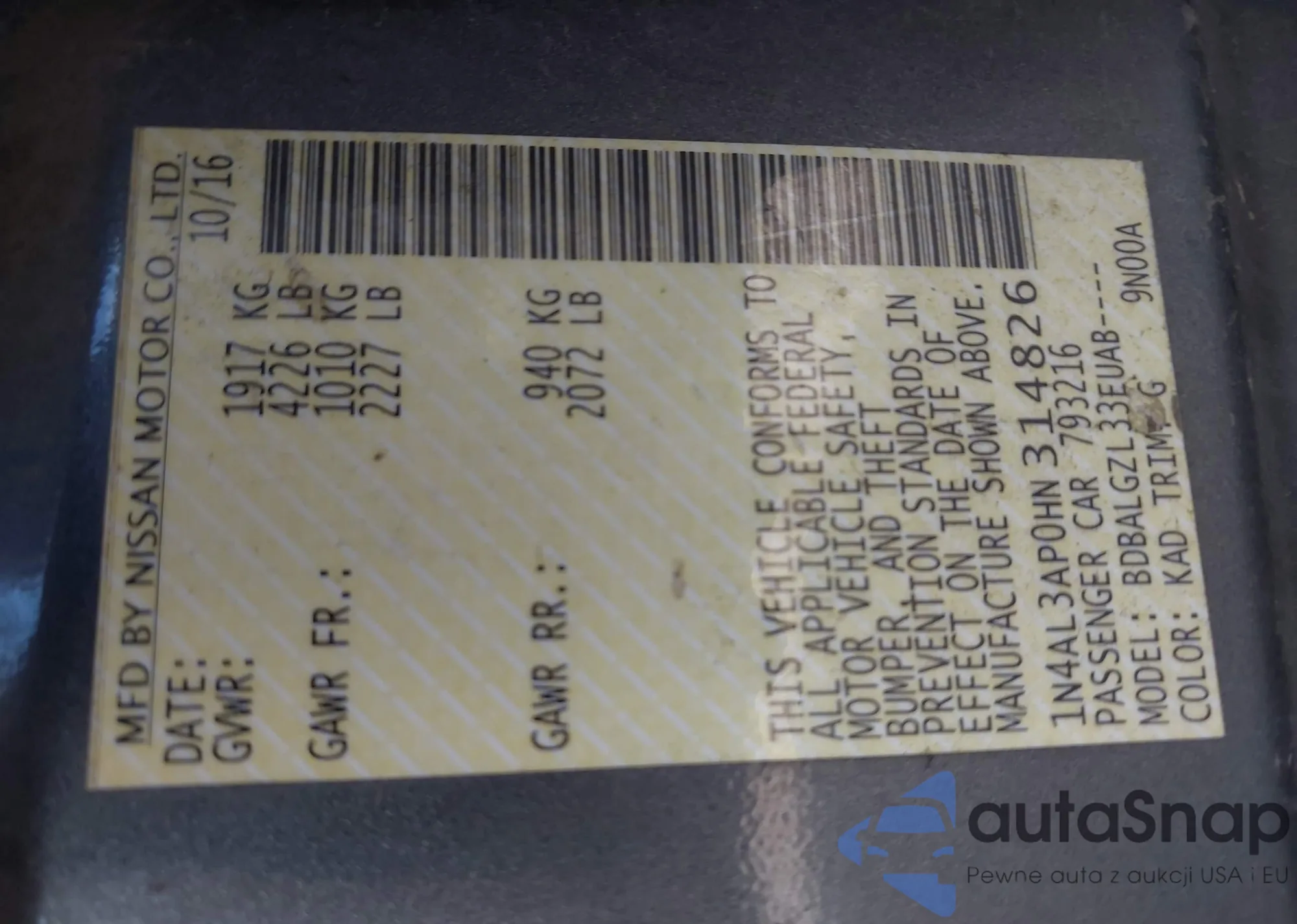 LOT: 43047610 VIN: 1N4AL3AP0HN314826