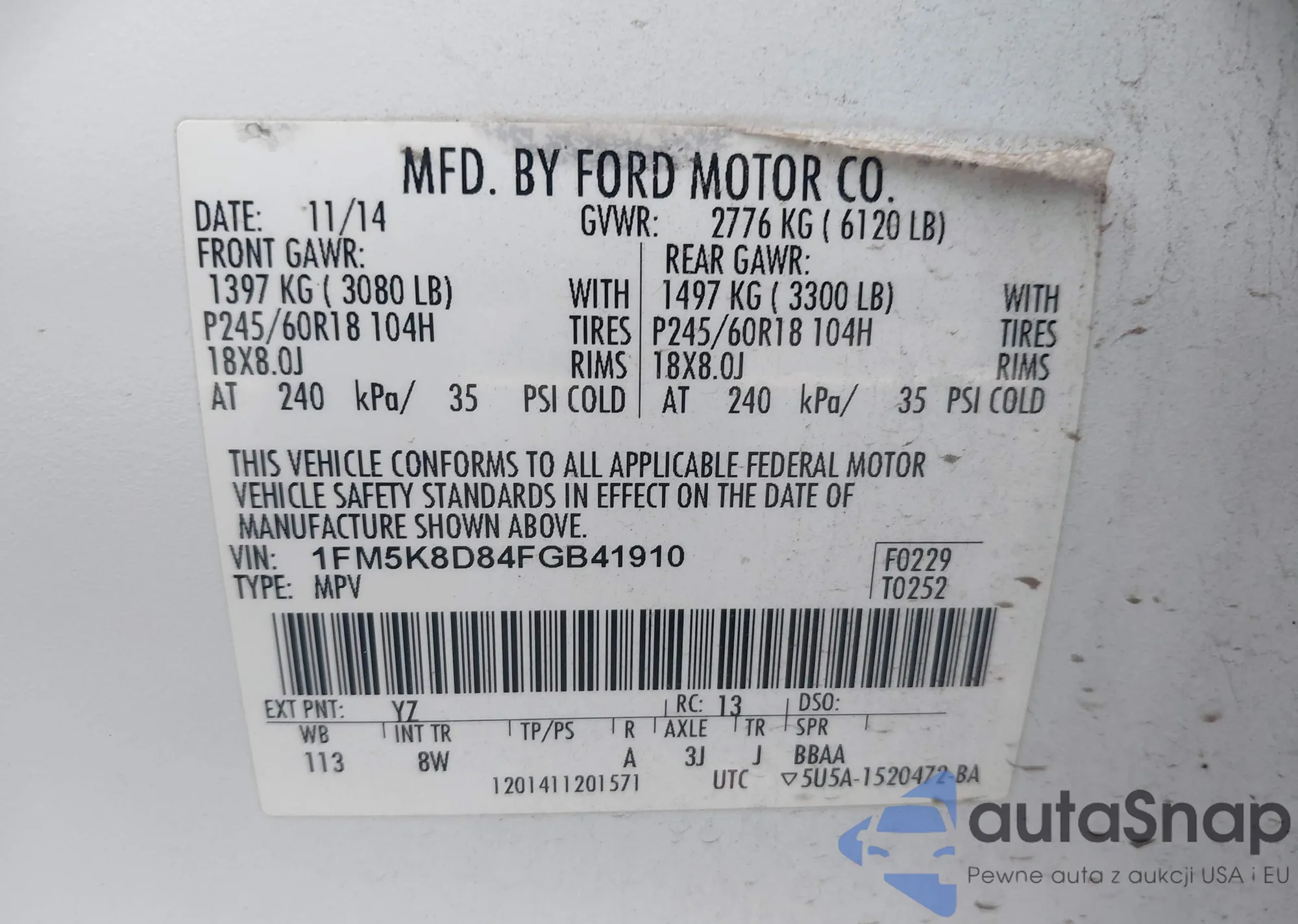 LOT: 43486851 VIN: 1FMCU9J9XEUB91165