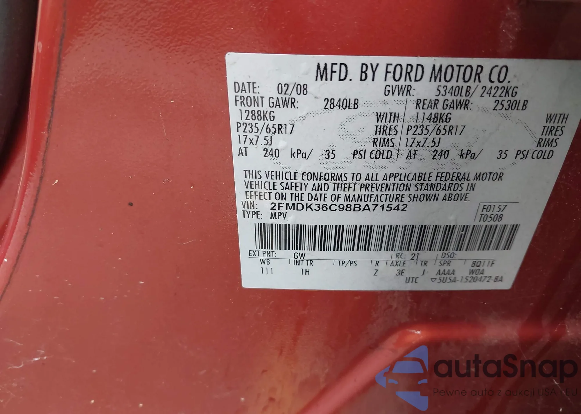 LOT: 43800753 VIN: 2FMDK36C98BA71542