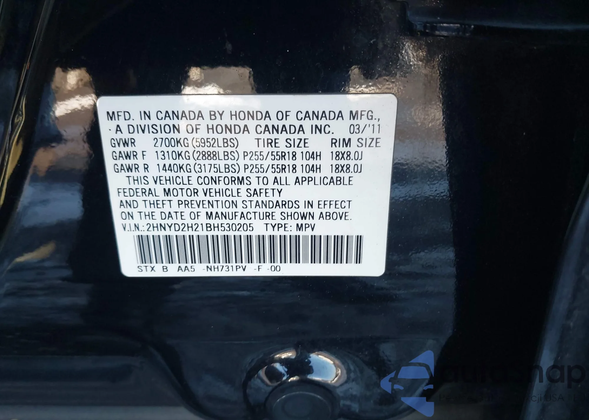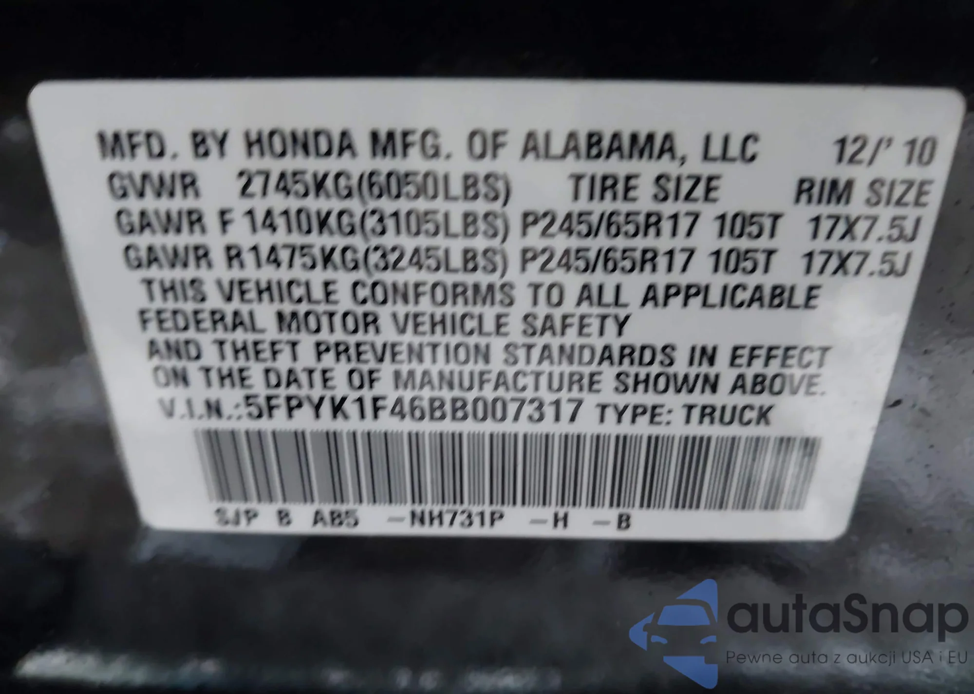 • VIN 5FPYK1F46BB007317